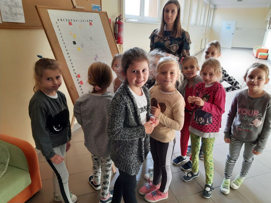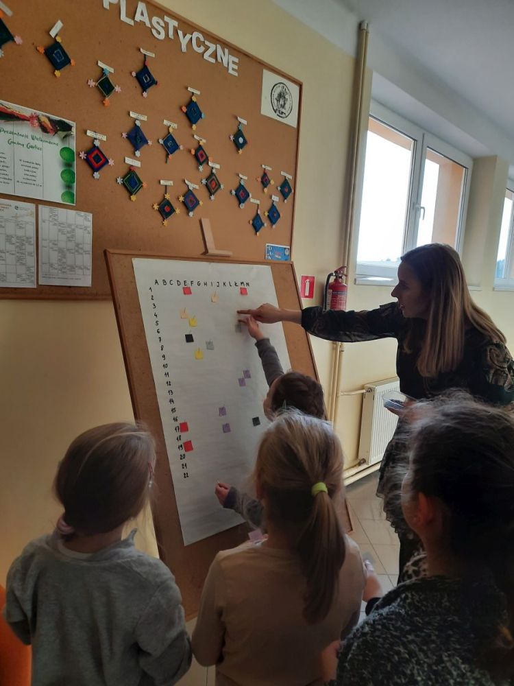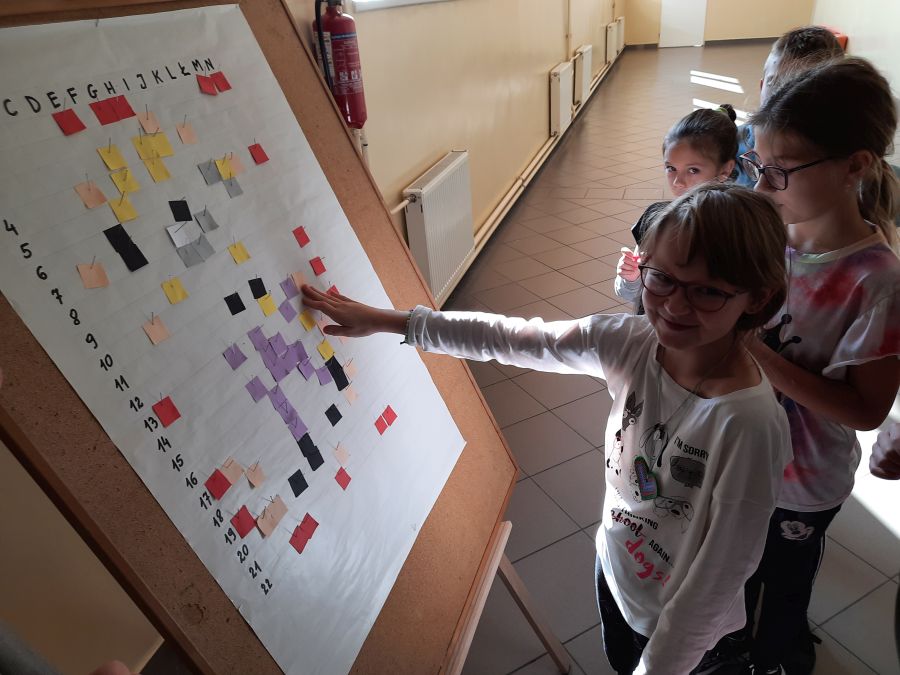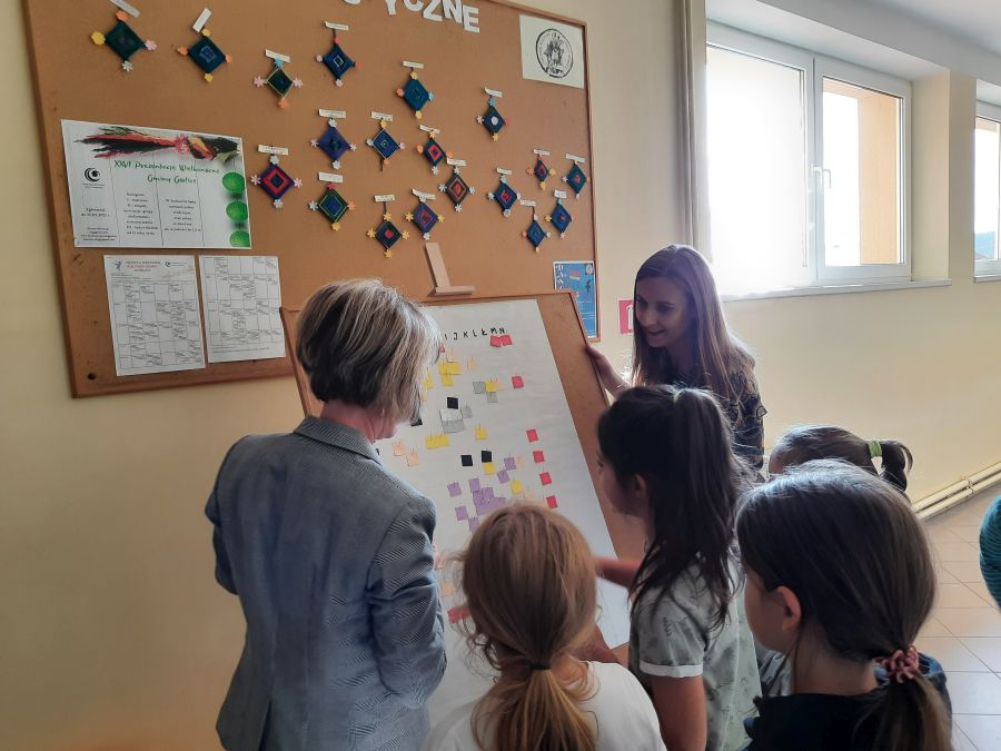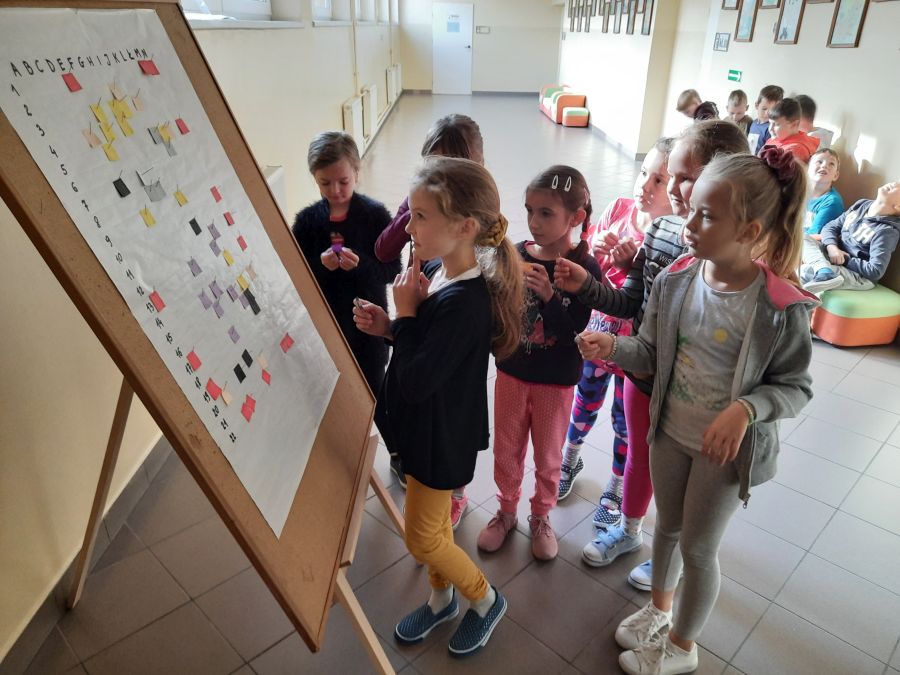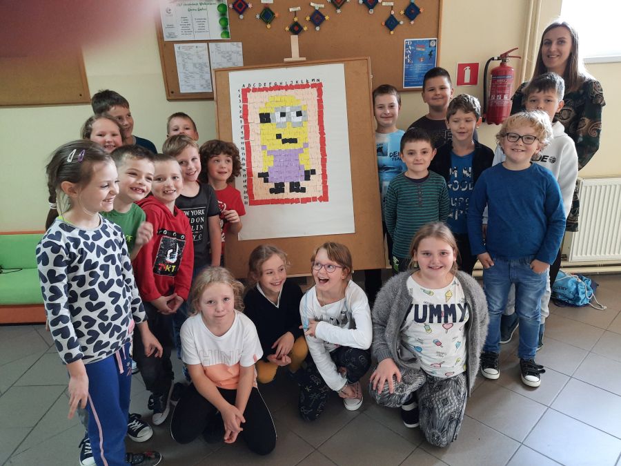 Najmłodsi uczniowie z klasy I – III kodowali z origami – wykorzystując matę do kodowania, tworzyli obrazek z wykorzystaniem kodu i puzli. Losowali poszczególne elementu kodu i stworzyli wspólnie "obraz" Minionka.