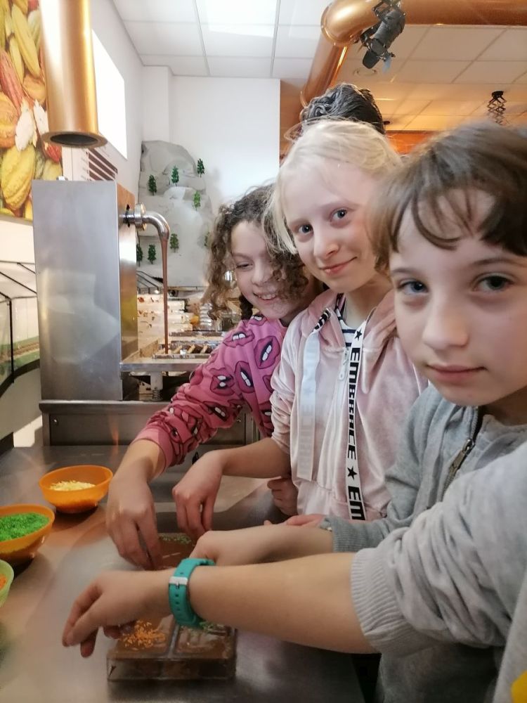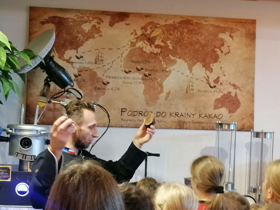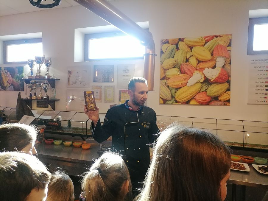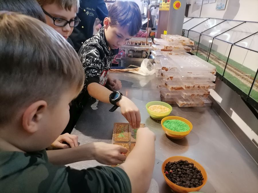 Właściciel zakładu zadbał o atrakcyjność warsztatów, organizując konkursy wiedzy, w których uważni uczniowie mogli zdobyć słodką nagrodę lub bon upominkowy. Pan M. Pelczar pokazał, jak wygląda prawdziwa linia produkcyjna. Dzieci mogły od podstaw zgłębiać tajniki produkcji, powstawania, zdobienia i pakowania wyrobów. Największych emocji doświadczyli podczas samodzielnego wyrobu czekolad i lizaków, zdobienia wykonanych ręcznie produktów. Wiedzę o ziarnie kakaowca wzbogacili też poprzez seans filmowy. Po spotkaniu uczniowie udali się na zakupy wyrobów z czekolady.