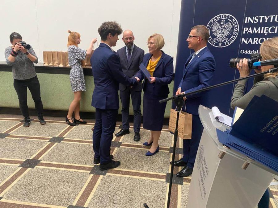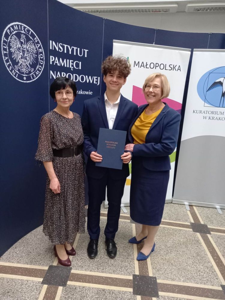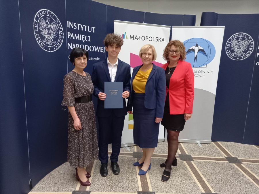 Antoni Ciapaj uczeń klasy ósmej 17 maja w Centrum Edukacyjnym IPN "Przystanek Historia" w Krakowie odebrał dyplom laureata oraz nagrody rzeczowe. Uzyskał 60 punktów na 60 możliwych, co uplasowało go na I miejscu w Konkursie Tematycznym Polscy żołnierze w walce o wyzwolenie Włoch, Francji, Belgii i Holandii podczas II wojny światowej dla uczniów szkół podstawowych województwa małopolskiego. Brawurowo przeszedł przez kolejne etapy: rozwiązywał test wiedzy, w oparciu o archiwalne źródła historyczne zredagował pracę pisemną "By wolnym był znów ich piastowski ród", którą obronił podczas ustnego przesłuchania dnia 30 marca. W zmaganiach konkursowych uczestniczyło 640 uczniów, a tytuł laureata wywalczyło tylko 21. Antoś udowodnił, jak wiele może uczeń osiągnąć wykorzystując predyspozycje, podejmując wyzwania. Godnie reprezentował naszą Szkołę. Ogromna satysfakcja z włożonego wysiłku, ogromne gratulacje uzdolnień, pełnego zaangażowania i rewelacyjnych efektów na najwyższym szczeblu.