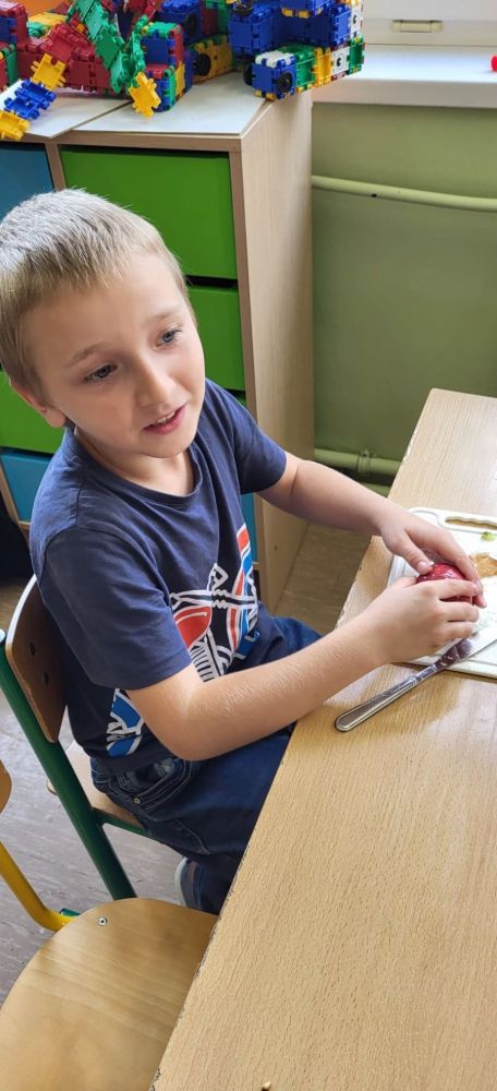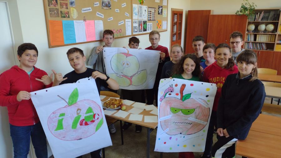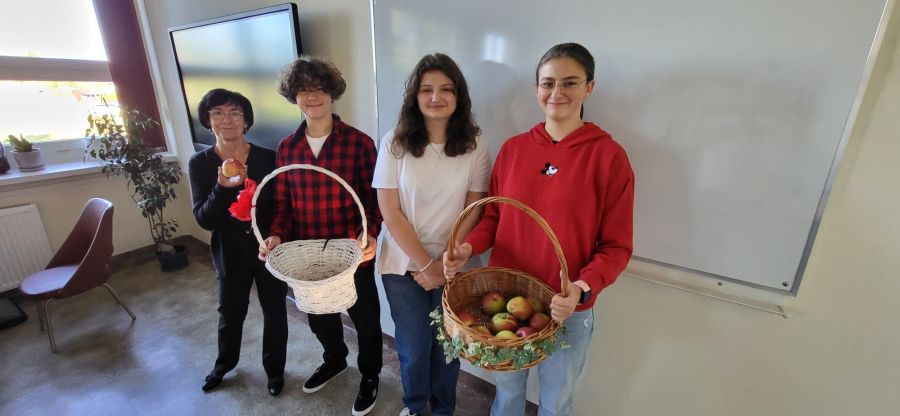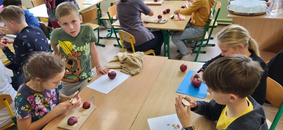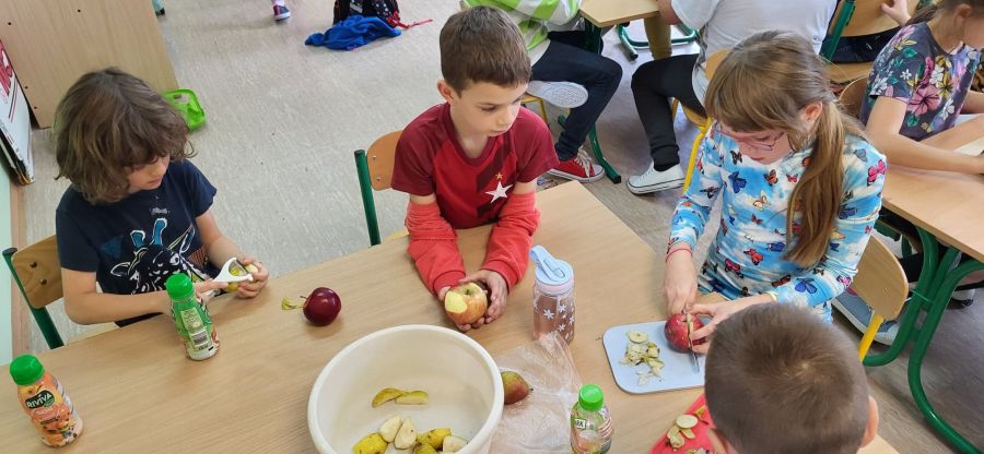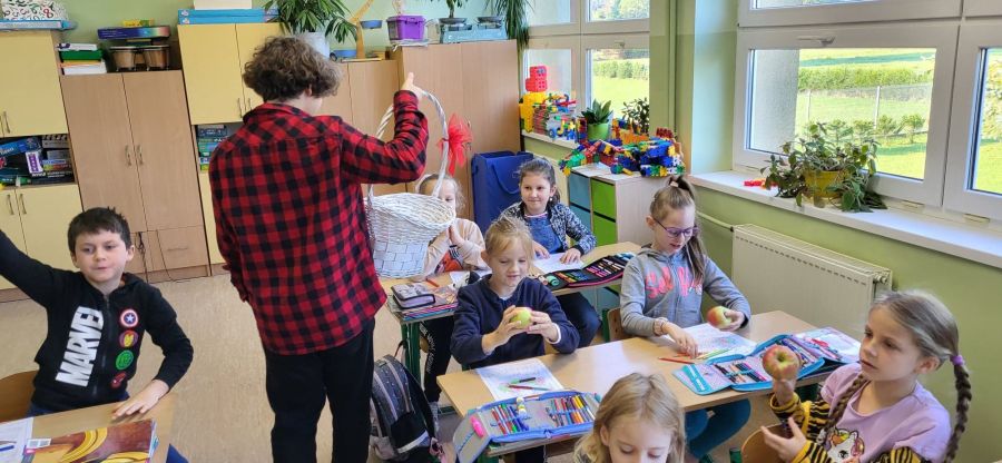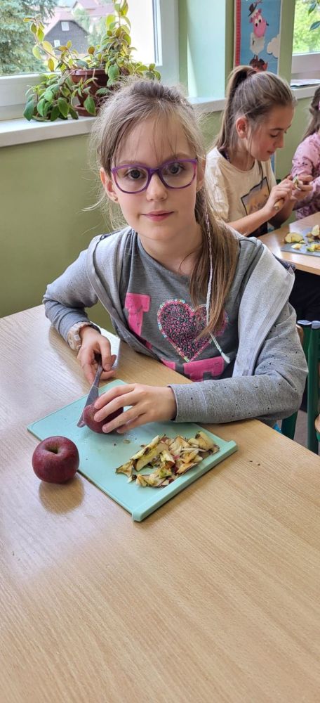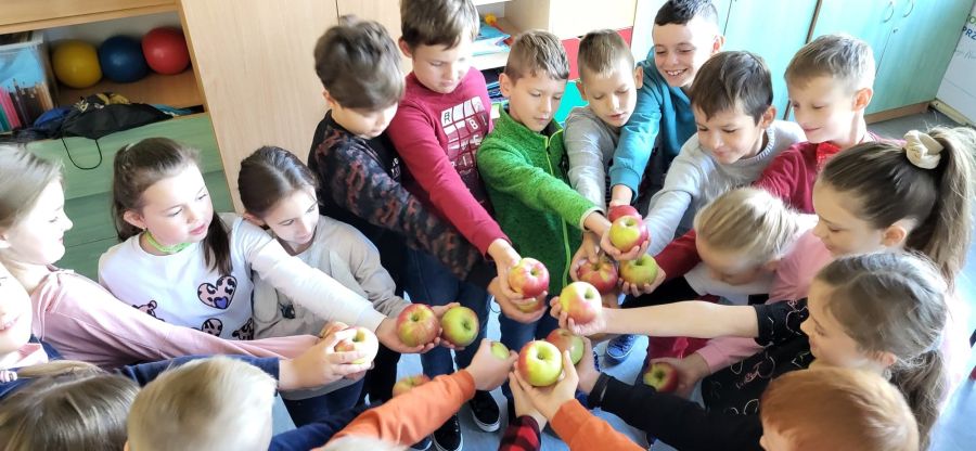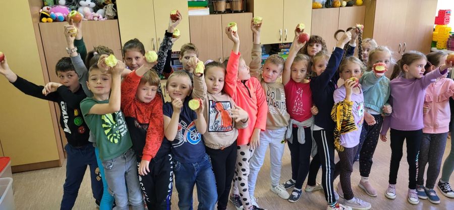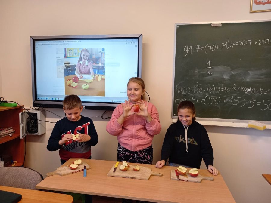 28 września świętowaliśmy Międzynarodowy Dzień Jabłka. W tym dniu dzieci przyszły do szkoły ubrane w kolorach jabłek. Była to też okazja, aby przypomnieć, że jedzenie warzyw i owoców jest podstawą, aby zapewnić sobie zdrowie. Samorząd Uczniowski częstował wszystkich jabłkami a temat owocu królował na każdej lekcji. I tak: jabłka dzieliliśmy i mnożyli, o jabłku pisaliśmy i śpiewali. Było jabłko rysowane, graficznie tworzone a nawet degustowane w postaci szarlotki czy soku.