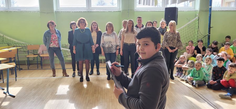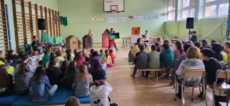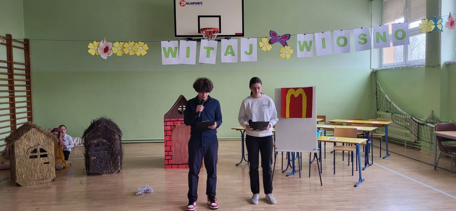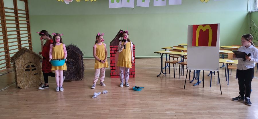 Następnie klasa V zaprosiła wszystkich na salę gimnastyczną na przedstawienie "Trzy świnki". Nie było to jednak zwykłe przedstawienie. Aby zrozumieć występujących aktorów, trzeba było mieć chociaż podstawowe umiejętności posługiwania się językiem angielskim. Uczniowie pracowali nad scenariuszem w języku angielskim i scenografią na dodatkowych zajęciach rozwijających zainteresowania, pod okiem pani Anny Chochołek.