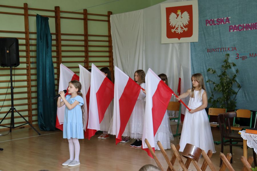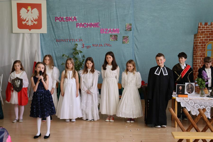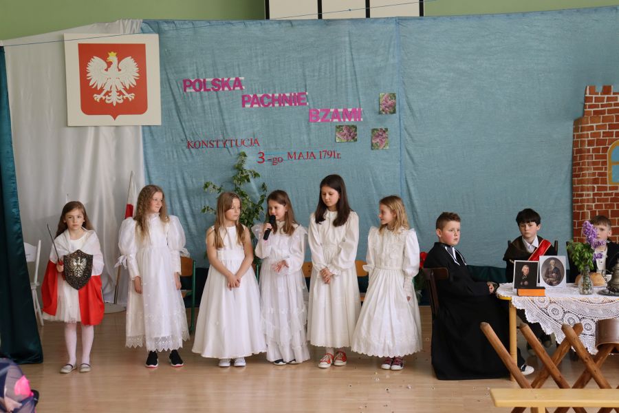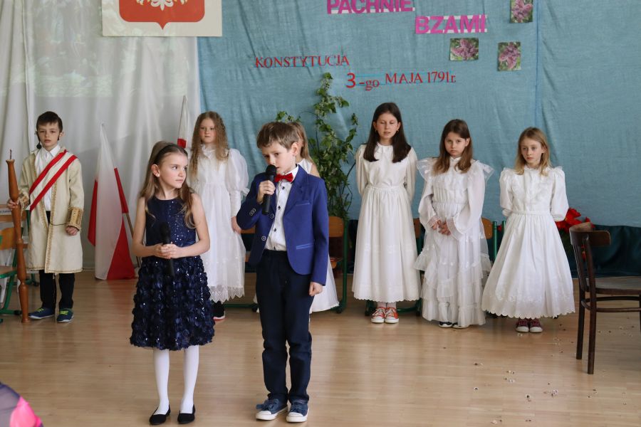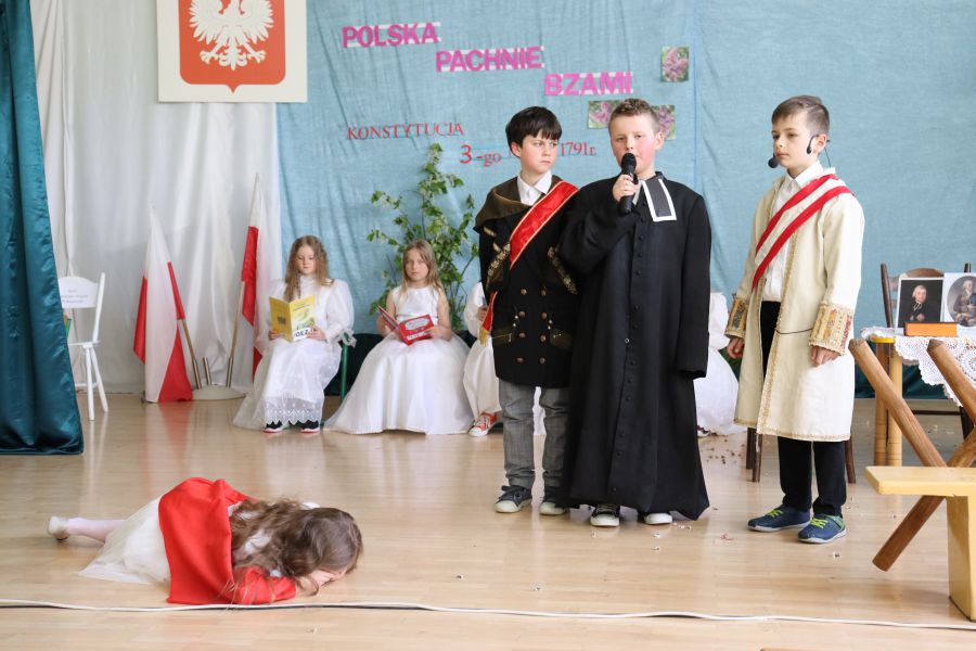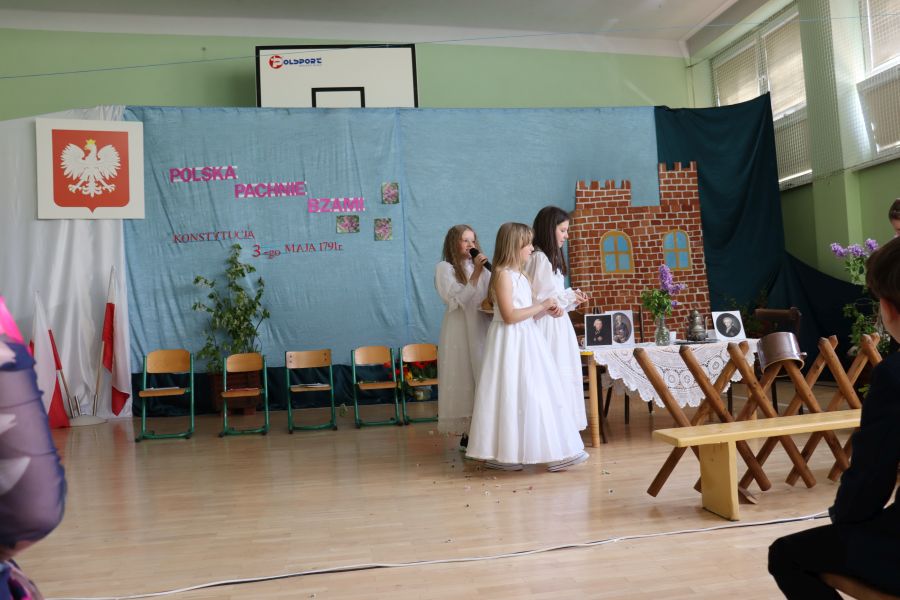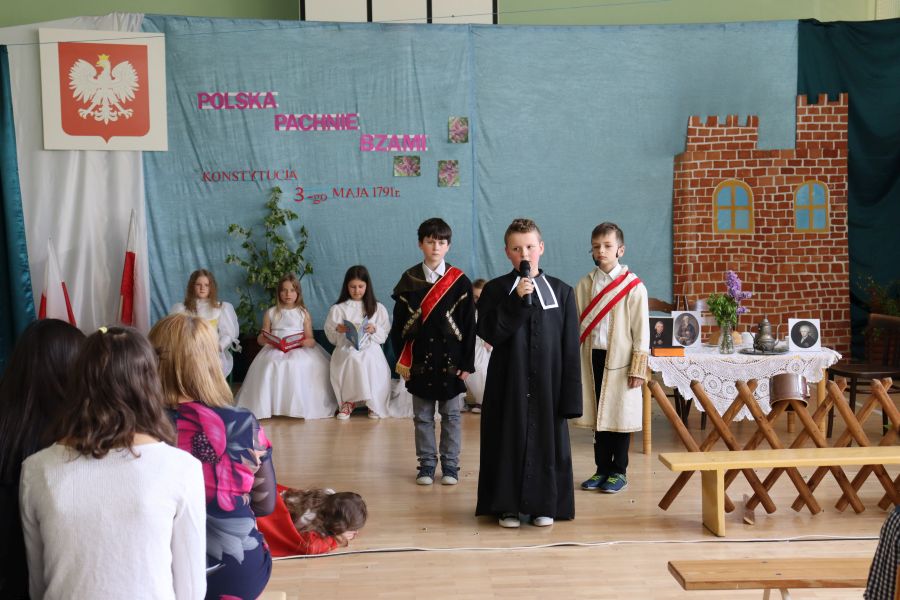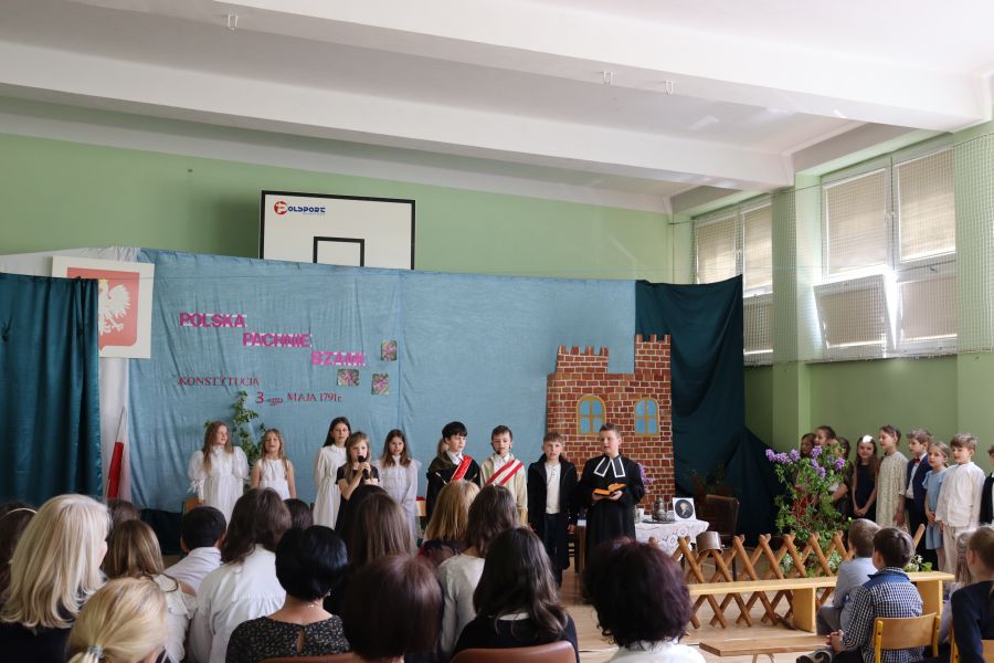 W dniu 28 kwietnia uczniowie klasy drugiej zaprezentowali montaż słowno – muzyczny z okazji Święta Konstytucji 3 Maja. Wśród bzów, kwiatów czeremchy i śpiewu ptaków, uczniowie zebrali się, by dać wyraz wspomnieniu tego ważnego dnia i pozwolić, by koledzy i koleżanki, a także widzowie zgromadzeni w sali gimnastycznej, wzbudzili w sobie refleksję nad naszymi dziejami… Udało się? Chyba tak. Kiedy wspomniano ten ważny moment, a z głośników płynął tekst preambuły, publiczności kręciły się łzy w oczach, ponieważ to, co mamy najcenniejszego, najpiękniejszego jest właśnie w nas i na tej ziemi, która nazywa się Polską…