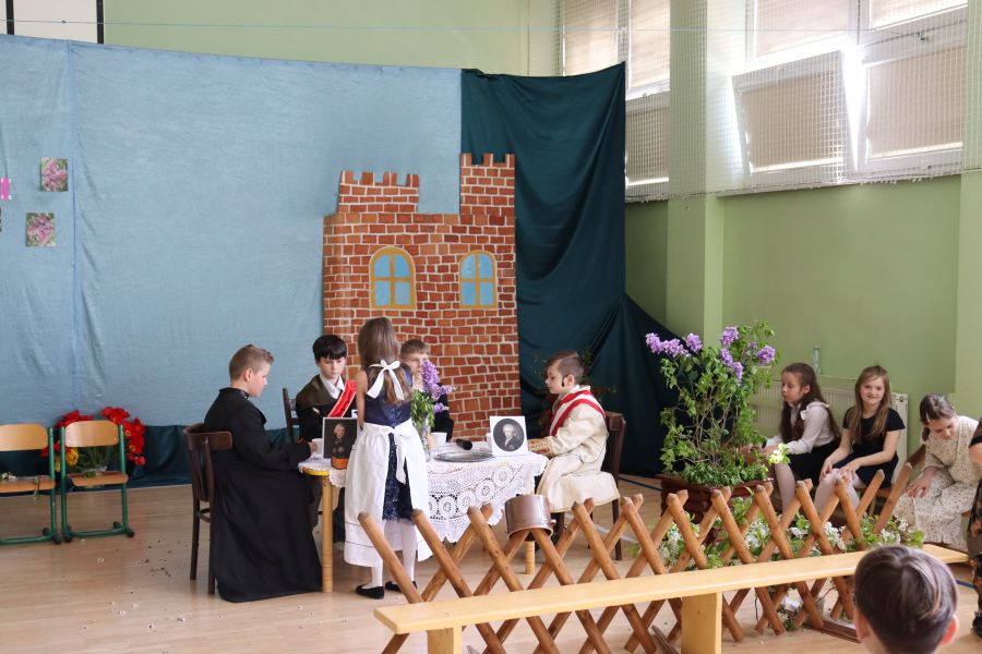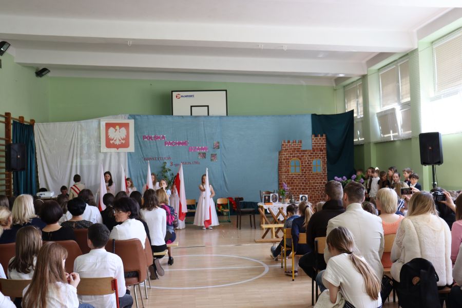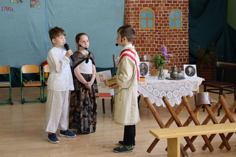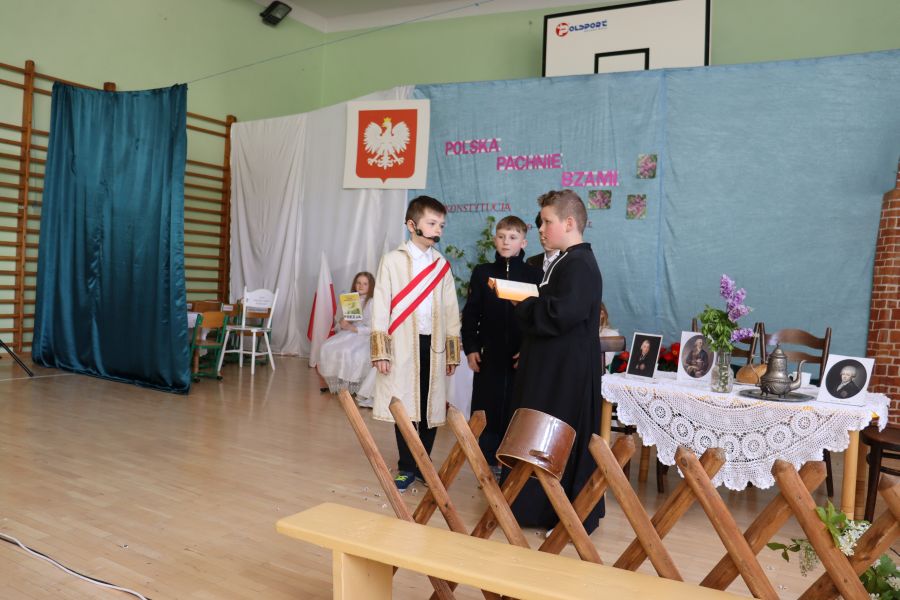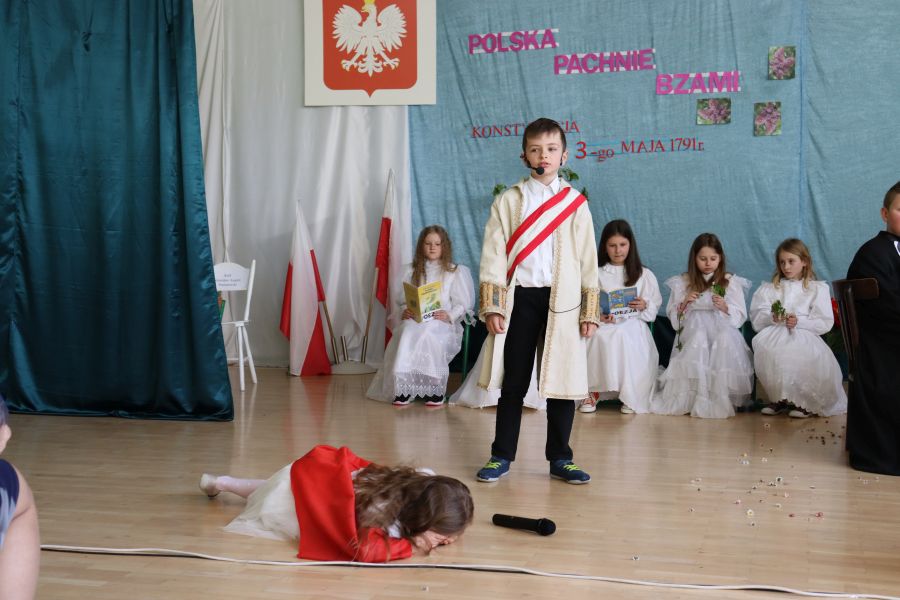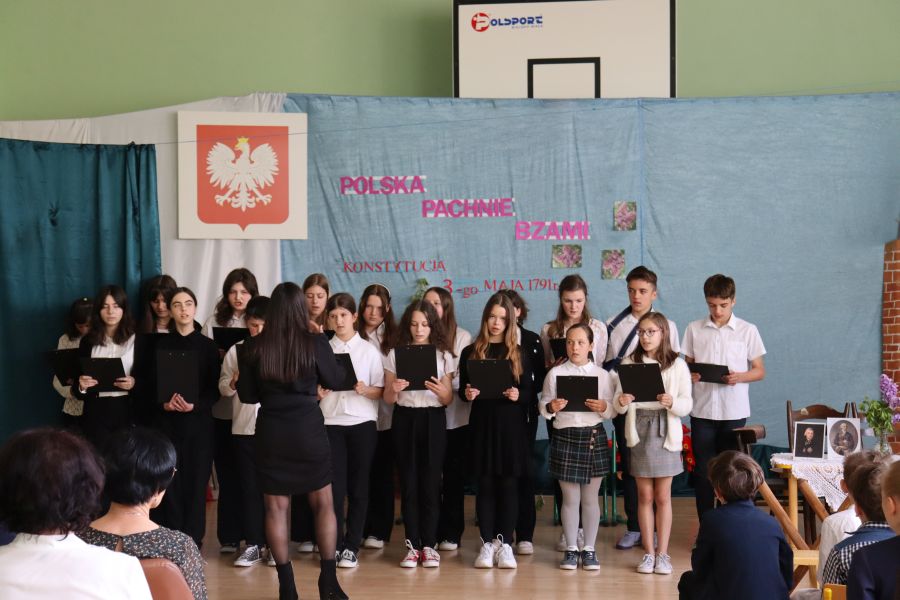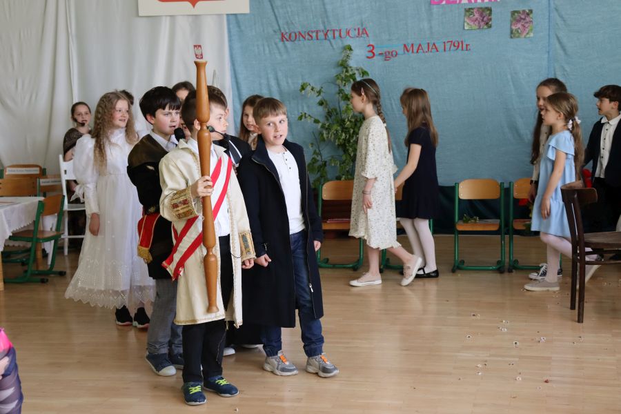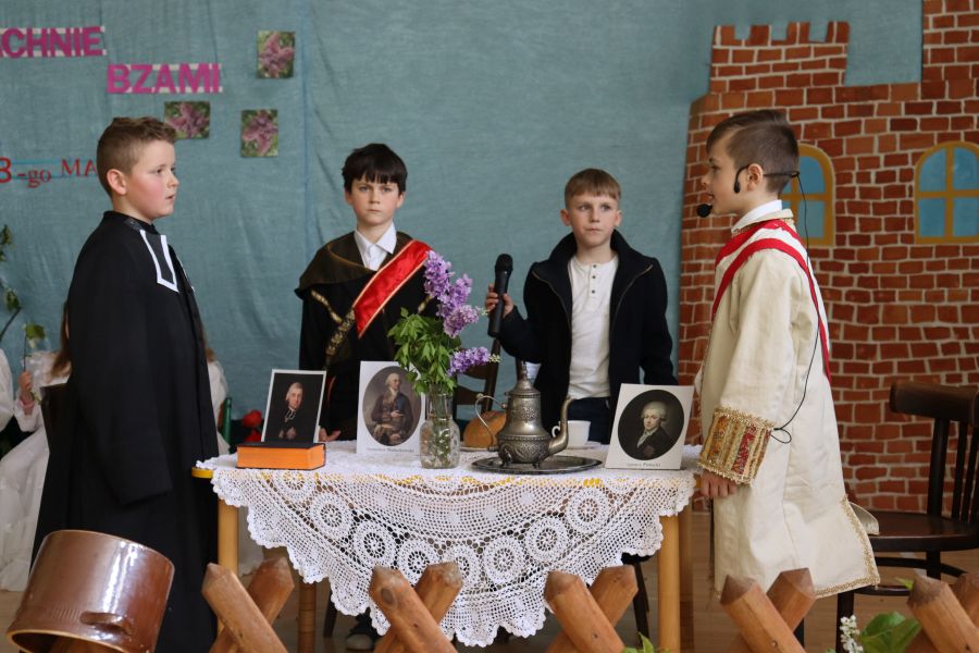 W dniu 28 kwietnia uczniowie klasy drugiej zaprezentowali montaż słowno – muzyczny z okazji Święta Konstytucji 3 Maja. Wśród bzów, kwiatów czeremchy i śpiewu ptaków, uczniowie zebrali się, by dać wyraz wspomnieniu tego ważnego dnia i pozwolić, by koledzy i koleżanki, a także widzowie zgromadzeni w sali gimnastycznej, wzbudzili w sobie refleksję nad naszymi dziejami… Udało się? Chyba tak. Kiedy wspomniano ten ważny moment, a z głośników płynął tekst preambuły, publiczności kręciły się łzy w oczach, ponieważ to, co mamy najcenniejszego, najpiękniejszego jest właśnie w nas i na tej ziemi, która nazywa się Polską…