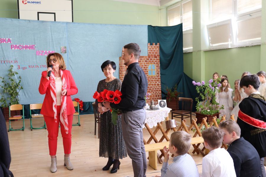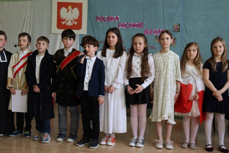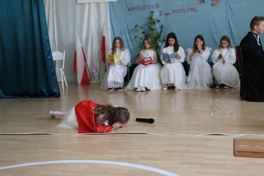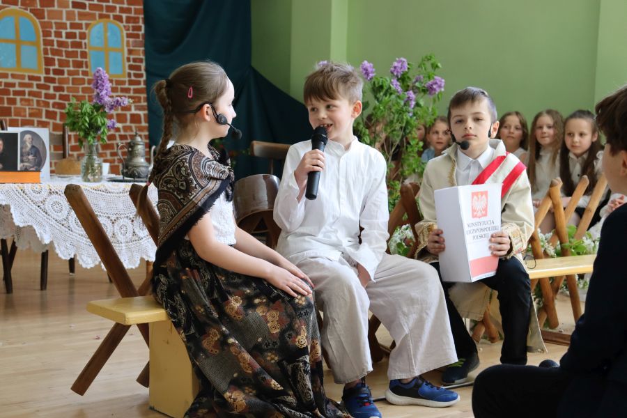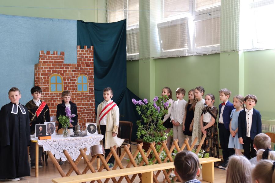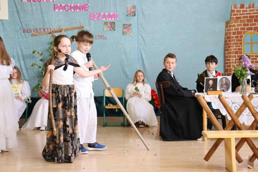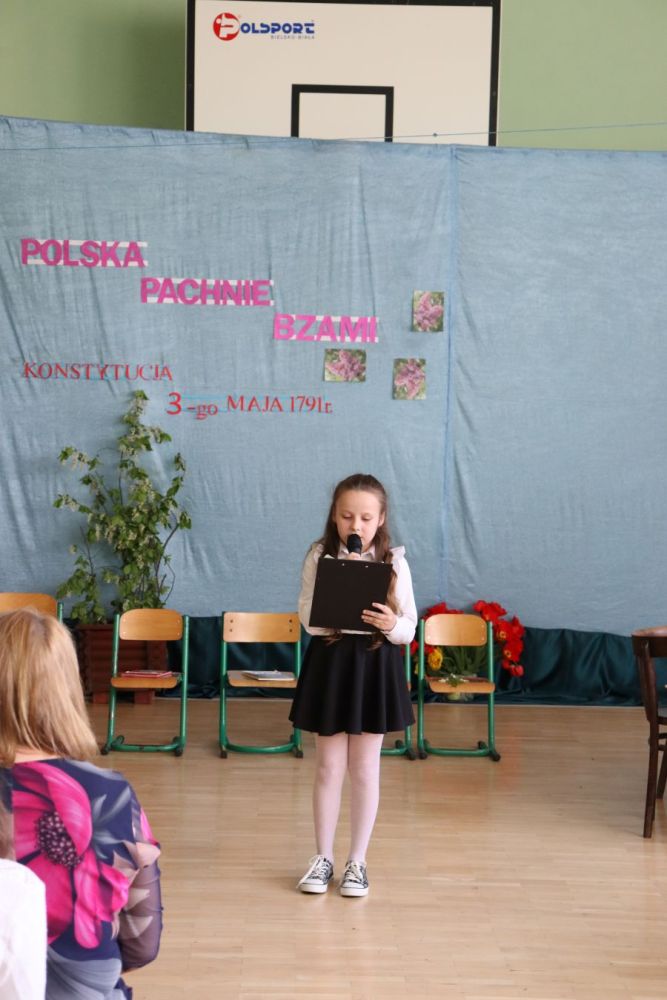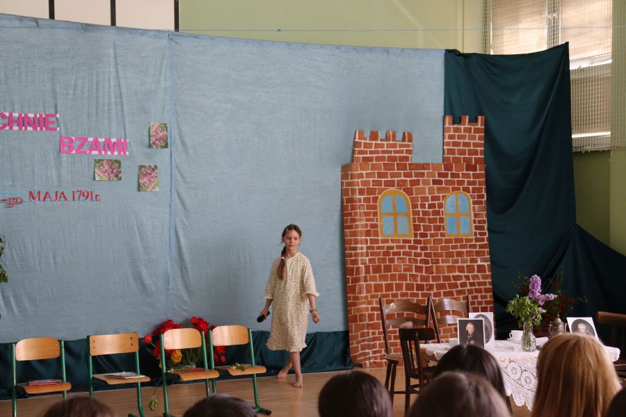 W dniu 28 kwietnia uczniowie klasy drugiej zaprezentowali montaż słowno – muzyczny z okazji Święta Konstytucji 3 Maja. Wśród bzów, kwiatów czeremchy i śpiewu ptaków, uczniowie zebrali się, by dać wyraz wspomnieniu tego ważnego dnia i pozwolić, by koledzy i koleżanki, a także widzowie zgromadzeni w sali gimnastycznej, wzbudzili w sobie refleksję nad naszymi dziejami… Udało się? Chyba tak. Kiedy wspomniano ten ważny moment, a z głośników płynął tekst preambuły, publiczności kręciły się łzy w oczach, ponieważ to, co mamy najcenniejszego, najpiękniejszego jest właśnie w nas i na tej ziemi, która nazywa się Polską…