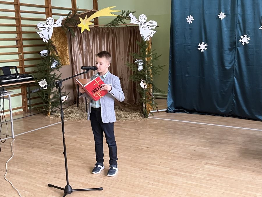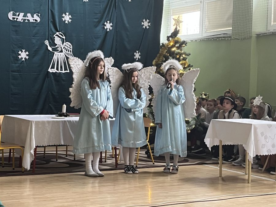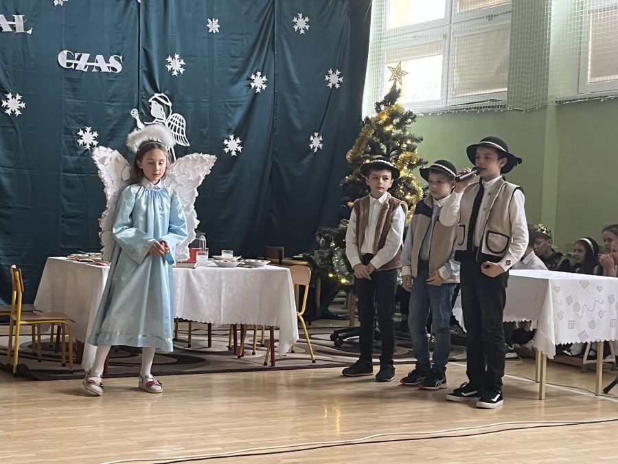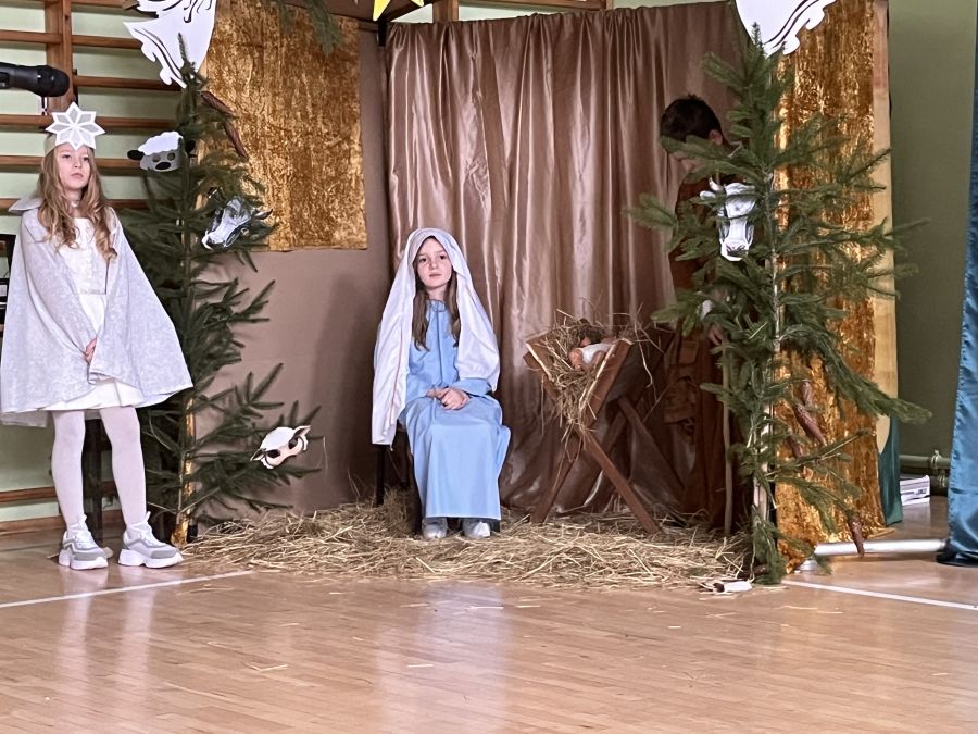 Uczniowie klasy III w bożonarodzeniowej scenerii zaprezentowali jasełka "Radości nastał czas…". Przedstawienie to pokazało polską tradycję Bożego Narodzenia, poprzedzonego dniem wigilijnym. Dzieci z wielkim przejęciem i zaangażowaniem odegrały swoje role. Przypomniały wszystkim sceny rozgrywające się w stajence betlejemskiej, tułaczkę Maryi i Józefa, pokłon pasterzy, monarchów oraz polskiej rodziny. Umiejętności recytatorskie, cudownie zaśpiewane kolędy i pastorałki zrobiły na wszystkich bardzo duże wrażenie.