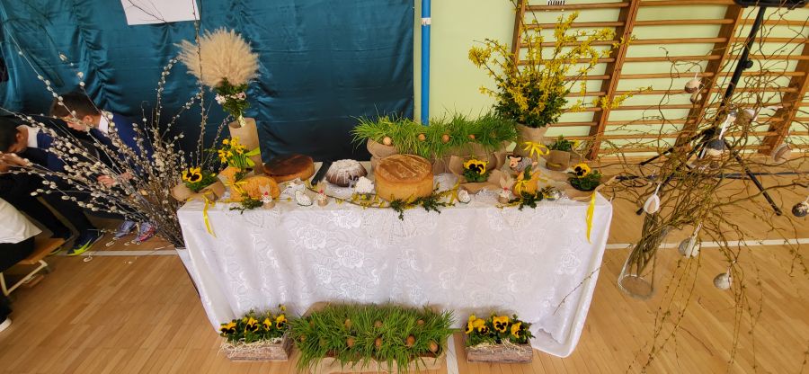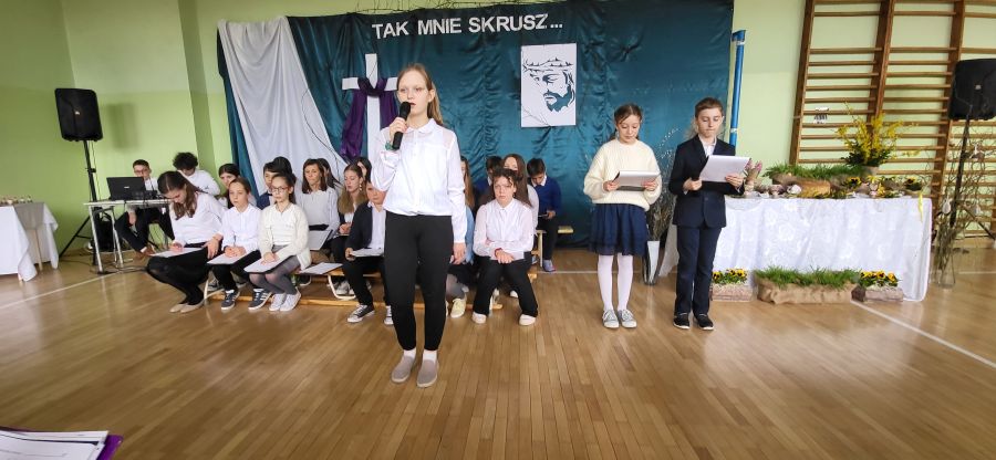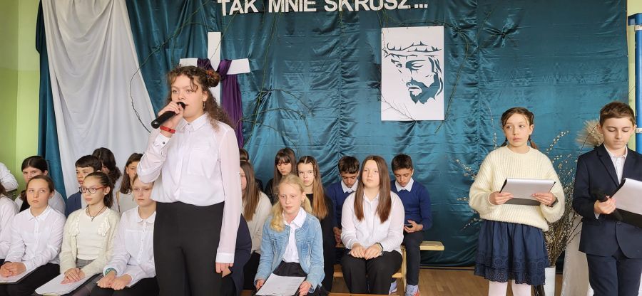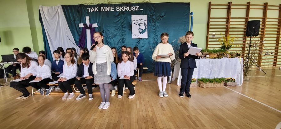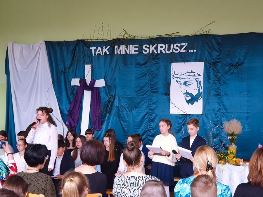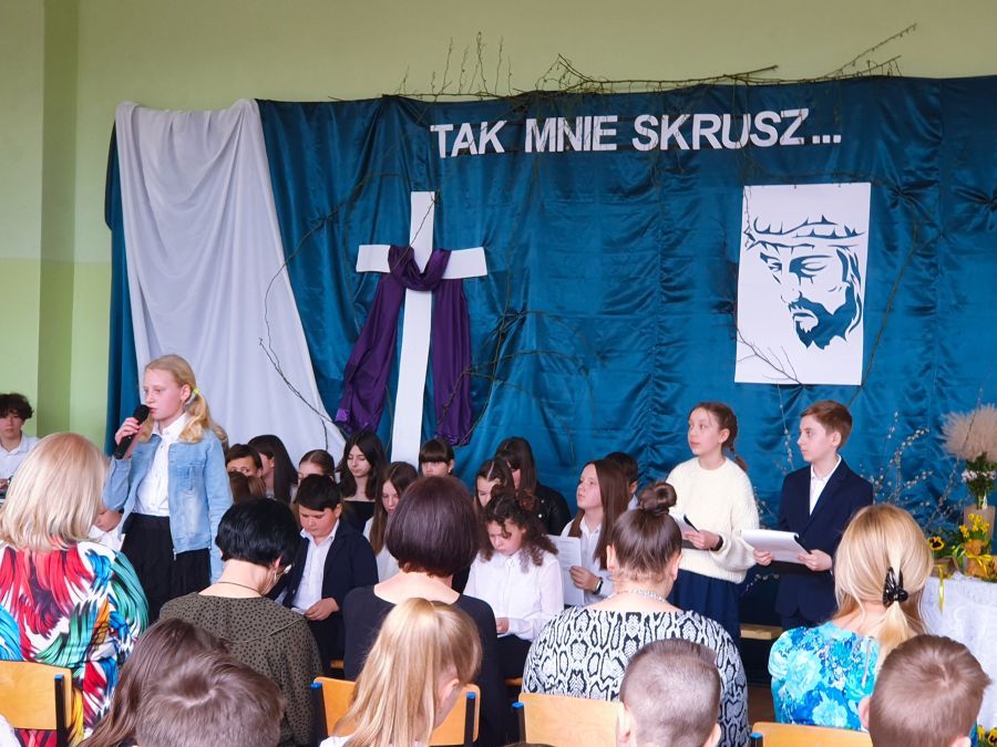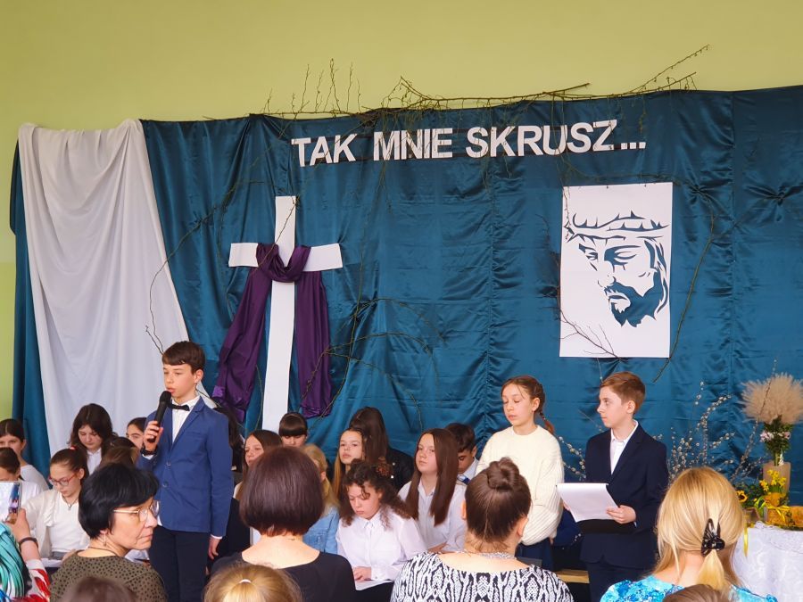 W duchowe przygotowanie do obchodów Świąt Wielkiej Nocy wprowadzili w dniu 5 kwietnia nauczycieli, uczniów i pracowników szkoły uczniowie klasy V i VI. Program słowno-muzyczny przygotowali pod kierunkiem wychowawców pani Joanny Nosal i pani Anety Motyki. Podczas występu pięknie recytowali wiersze, ukazując sens najważniejszych świąt w całym roku liturgicznym.