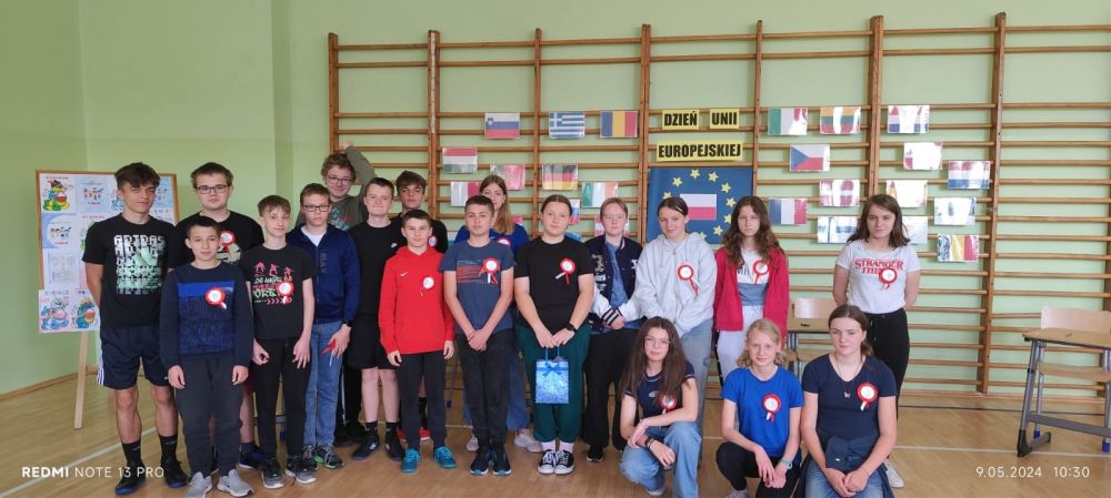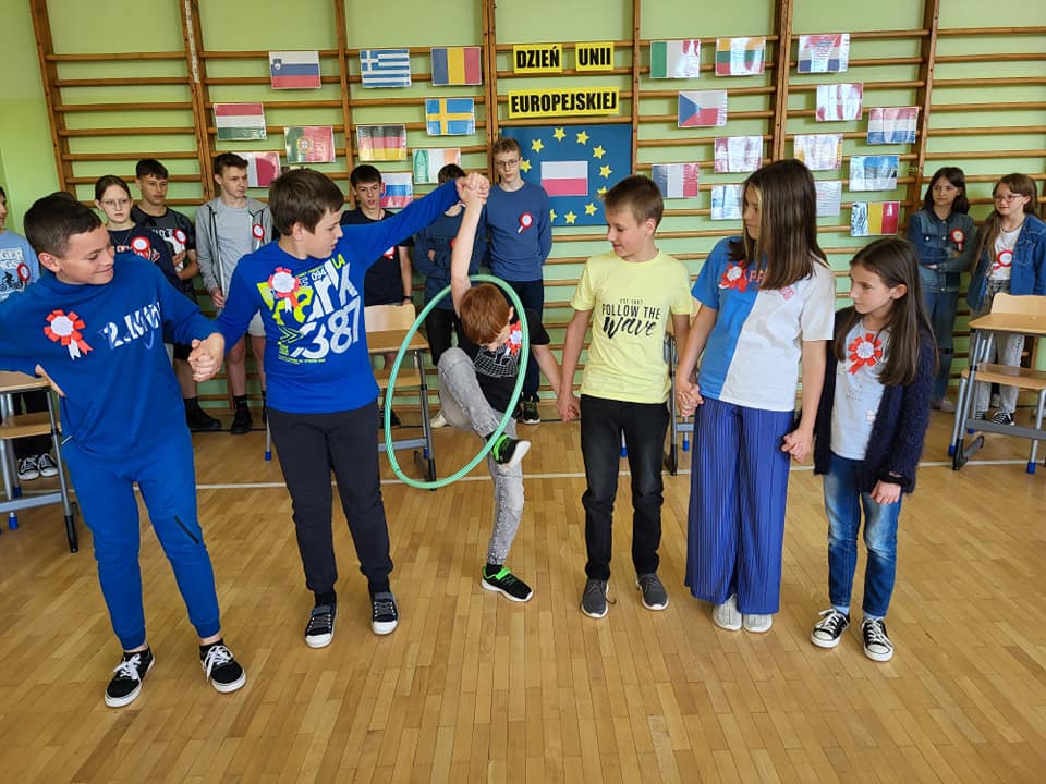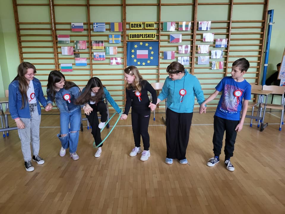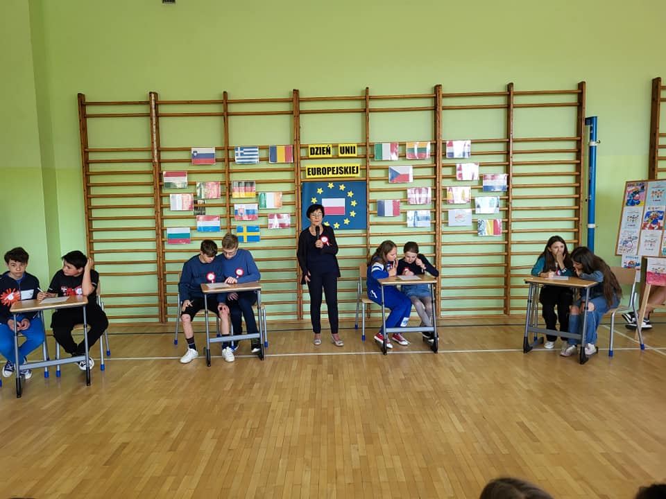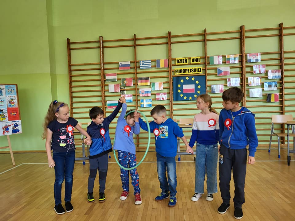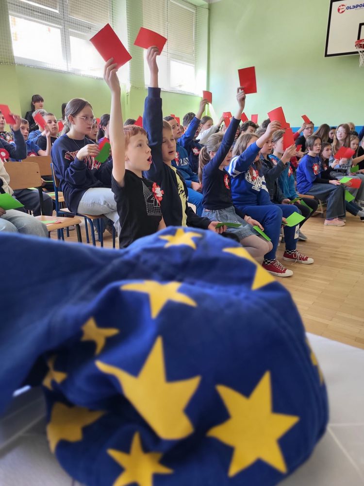 Każda z aktywności została tak zaprojektowana, aby przez ruch i interakcję angażować uczestników w kreatywny sposób, rozwijając ich wiedzę i zainteresowanie różnorodnością kulturową naszego kontynentu. "Kreatywne kolorowanki": Syriusz, gwiaździsta flaga, wykreślanki wyrazowe i okolicznościowe plakaty pozwoliły na utrwalenie symboli UE poprzez zaangażowanie artystyczne. "Flagowe zamieszanie" i "Melodyczne podróże" w dynamiczny sposób wprowadziły elementy geografii i muzycznych hymnów. Quizowe zadania "Euro-ciekawostek" w wyjątkowo humorystyczny sposób utrwaliły wiedzę o językach, stolicach, walucie, specyficznych atrakcjach krajów członkowskich. Nawiązaniu interakcji z publicznością służyło rozpoznawanie zdań Prawda-Fałsz. Gorące słowa podziękowań kierujemy do pań: B. Kudławiec, J. Cieśli, I. Adamczyk-Szury, które zadbały o rzetelne punktowanie aktywności uczniowskich. Zabawy sprawnościowe oraz sondaż społeczny "Co wiem o Polsce i UE" rozwinęły umiejętności społeczne, komunikacyjne i pracy zespołowej, równocześnie promując idee jedności i współpracy, które są fundamentami Unii Europejskiej.