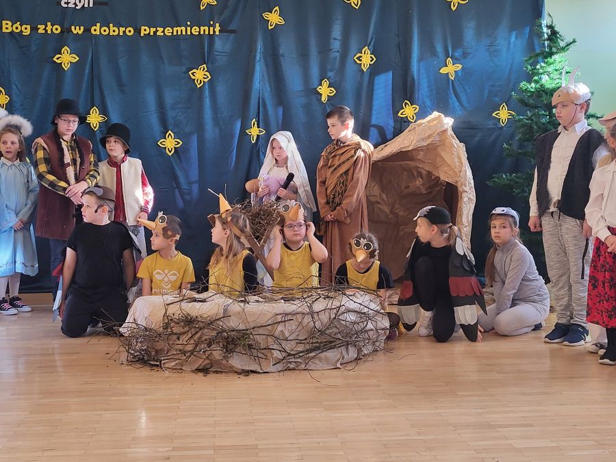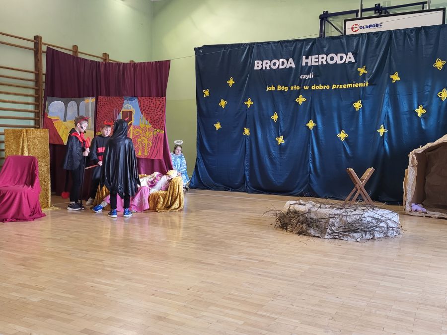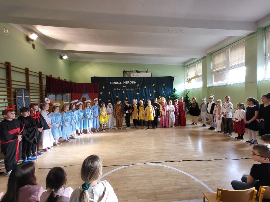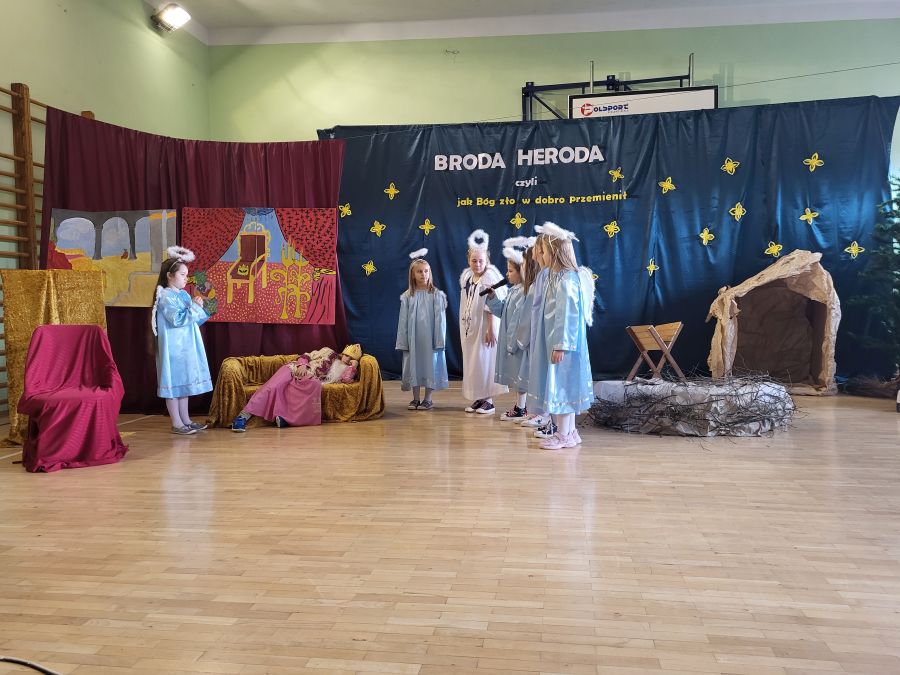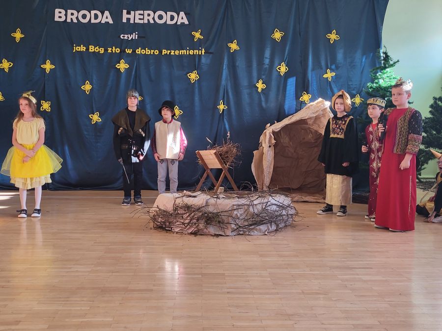 4 stycznia w sali gimnastycznej naszej szkoły zapanowała magiczna atmosfera. Stało się to za sprawą dźwięków kolędy wygrywanej na dzwonkach przez ucznia kl. I Karola Zająca. Następnie wystawione zostało przedstawienie "Broda Heroda, czyli o tym, jak Bóg zło w dobro przemienił". Obok postaci Maryi, Józefa, Aniołów, Diabłów i Pasterzy wystąpiły także zwierzęta: osiołek, owieczki. W przedstawieniu szczególną rolę odegrała pewna ptasia rodzina. Jej losy w niesamowity sposób, także za sprawą brody Heroda, skrzyżowały się z przeżyciami Świętej Rodziny. W tej opowieści Herod coś stracił, ptaszki i ludzkość zyskały, a Bóg zło w dobro przemienił. Uczniowie z klasy II i III wykazali się znakomitą grą aktorską, umiejętnościami recytatorskimi i wokalnymi. Ta wzruszająca, a zarazem pełna humoru opowieść, zawierała w sobie ważne przesłanie dla widzów: "Dobro zwycięża zło".