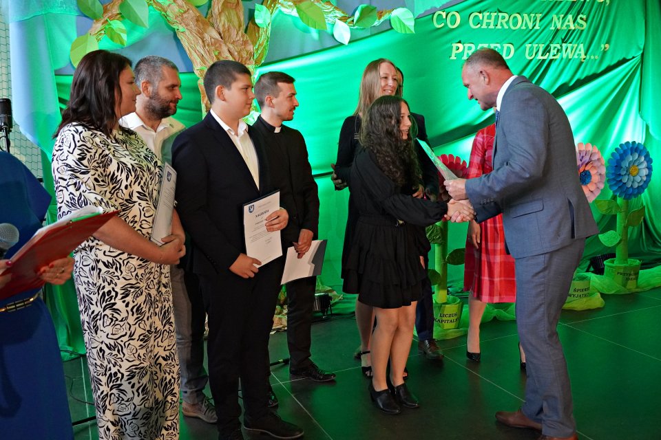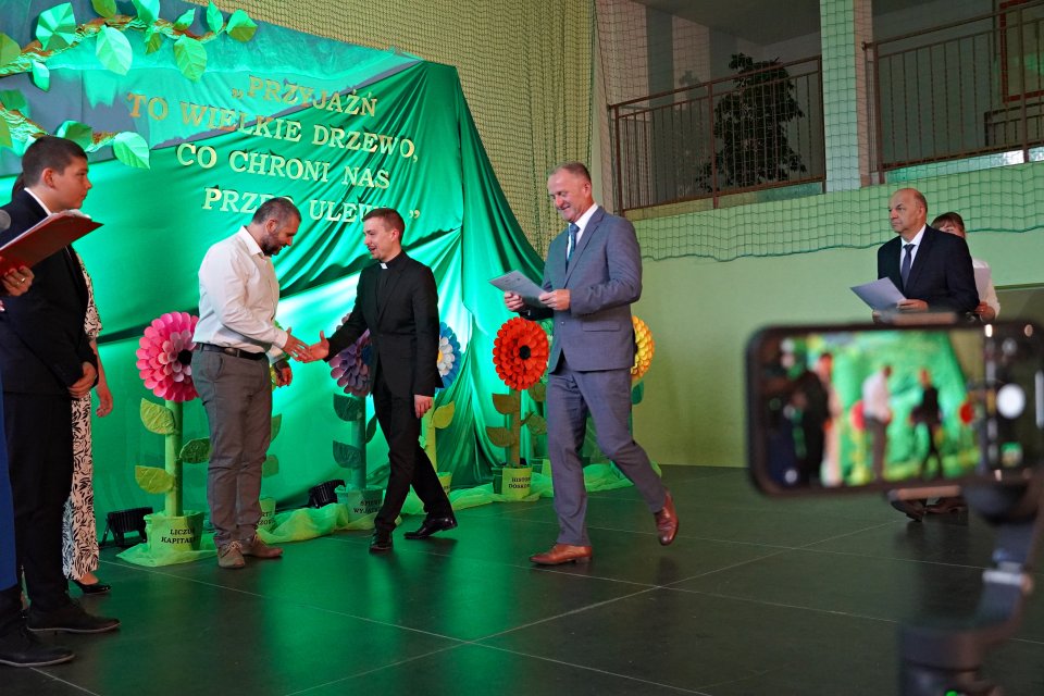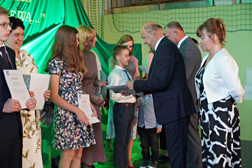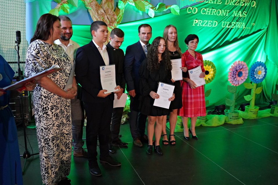 Gmina Gorlice już po raz dziewiąty nagrodziła wyróżniających się uczniów i po raz dziewiąty nasza szkoła mogła pochwalić się liczną reprezentacją. Uroczystość odbyła się we czwartek 13 czerwca br. w Zespole Szkolno-Przedszkolnym w Kwiatonowicach. Z rąk Jana Przybylskiego, wójta Gminy Gorlice, Mieczysława Skowrona, przewodniczącego Rady Gminy oraz Agaty Cup, dyrektora Oświatowego Zespołu Ekonomiczno-Administracyjnego nagrody odebrali uczniowie klasy ósmej: Franciszek Ciapaj - finalista konkursu biblijnego, Beata Kamyk – laureatka II miejsca konkursu historycznego, Krzysztof Kukla - finalista konkursu historycznego oraz Marcel Niziołek i Adam Wierzchanowski uczniowie klasy czwartej, Jagoda Bukowska uczennica klasy siódmej. Za wojewódzkie i powiatowe sukcesy sportowe nagrody odebrali: Filip Augustyn, Franciszek Ciapaj, Paweł Falisz, Wiktor Fejklowicz, Filip Kamiński, Gabriel Kucharczyk, Mateusz Kucharczyk, Marcin Uszko, Kacper Wilk, Gabriel Ryba, Bartłomiej Wadas, Wiktor Wantuch. Obok uczniów na estradzie stanęli dumni rodzice oraz ich merytoryczni opiekunowie: Małgorzata Stępień, ks. Michał Gądek oraz Ryszard Jamro.
