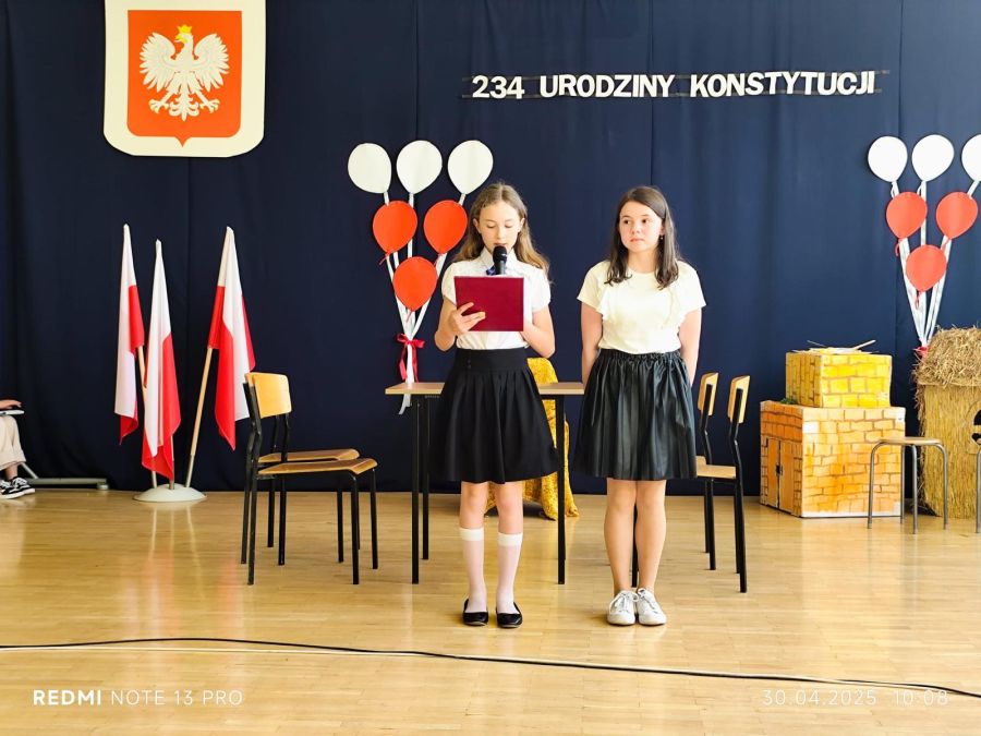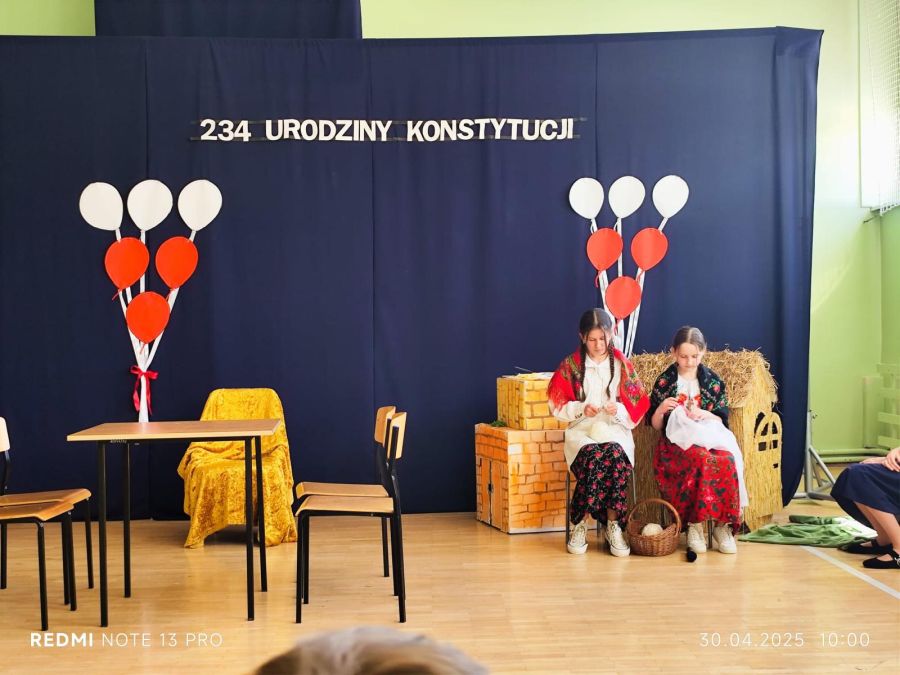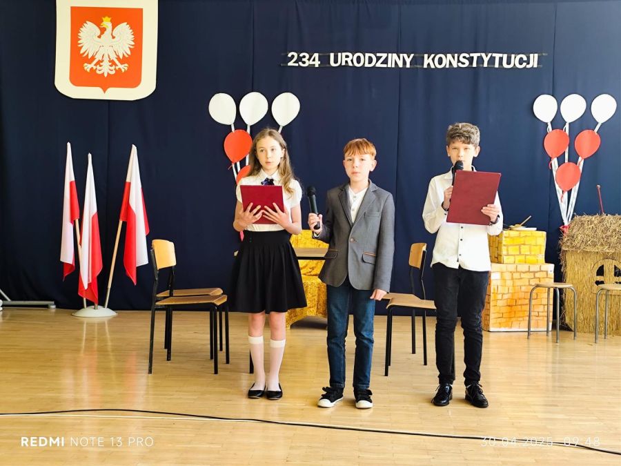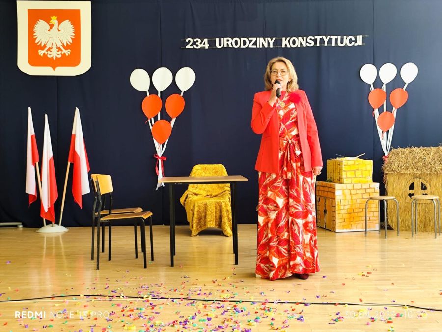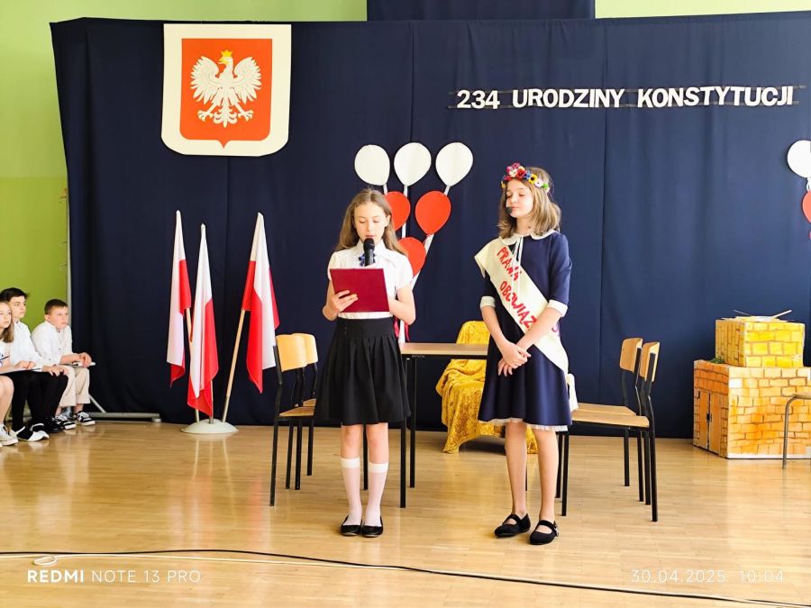 W środę 30 kwietnia uczniowie klas czwartej i piątej odegrali porywające widowisko z Konstytucją w roli głównej. Z bogatej, ale trudnej historii Polski, przybliżyli te fragmenty, dzięki którym Polacy dziś cieszą wolnością i równością, mają swój własny dom. Zawdzięczają to tym, którzy stawiali dobro państwa na pierwszym miejscu, również tym, którzy musieli przelewać krew. W najtrudniejszym XVIII wieku postępowi Polacy uchwalili pierwszą w Europie, a drugą na świecie "Ustawę Rządową", która dowartościowała Wolność, Naród, Ojczyznę. To ważne sprawy dla każdego. Kolejna rocznica jest okazją do refleksji, pamięci, odpowiedzialności każdego pokolenia za utrzymanie suwerenności. Wolnym jest ten, co żyje w wolnym kraju.