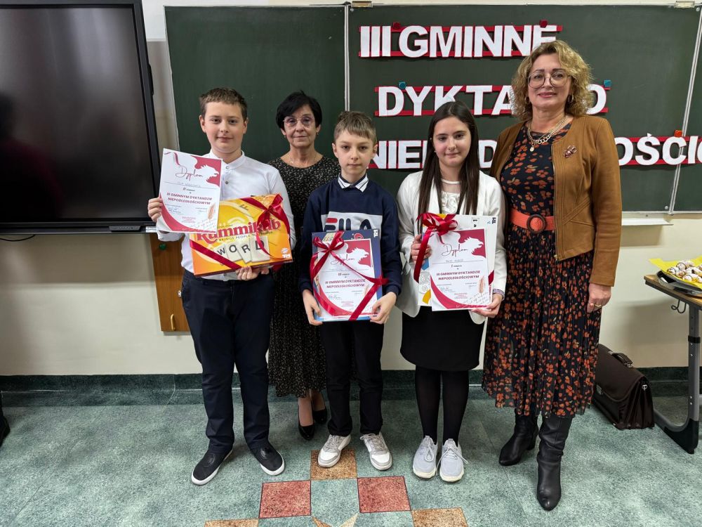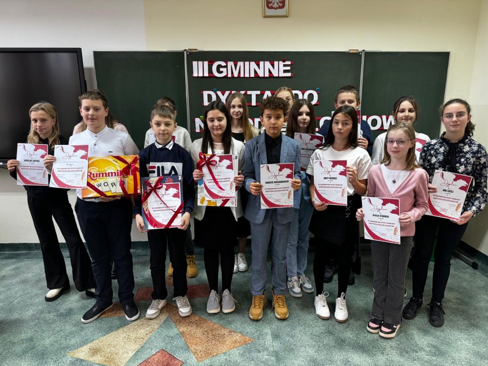 Dbamy o piękno naszego języka ojczystego. W środę 20 listopada br. zorganizowaliśmy już po raz trzeci Gminne Dyktando Niepodległościowe "Wybiła godzina!" Reprezentanci klas 4-6 z ośmiu szkół podstawowych sprawdzali swoje umiejętności ortograficzne. Dyplomy, nagrody rzeczowe oraz gratulacje z rąk Pani dyrektor Iwony Jamro odebrali laureaci: Maja Moroń (SP Zagórzany) I miejsce, Filip Wołkowicz (SP Zagórzany) II miejsce oraz Tymoteusz Lisowicz (SP Ropica Polska) III miejsce. Prace uczniów oceniała komisja konkursowa w składzie: Katarzyna Ciapaj, Barbara Kudławiec, Małgorzata Stępień i Izabela Adamczyk-Szura. Wszyscy uczestnicy otrzymali piękne okolicznościowe dyplomy potwierdzające udział w zmaganiach językowych. Organizacyjnie wydarzenie przygotowały Joanna Cieśla, Aneta Motyka i Małgorzata Stępień. Uczestnikom gratulujemy świetnych wyników. Dziękujemy wszystkim za efektywną współpracę.
