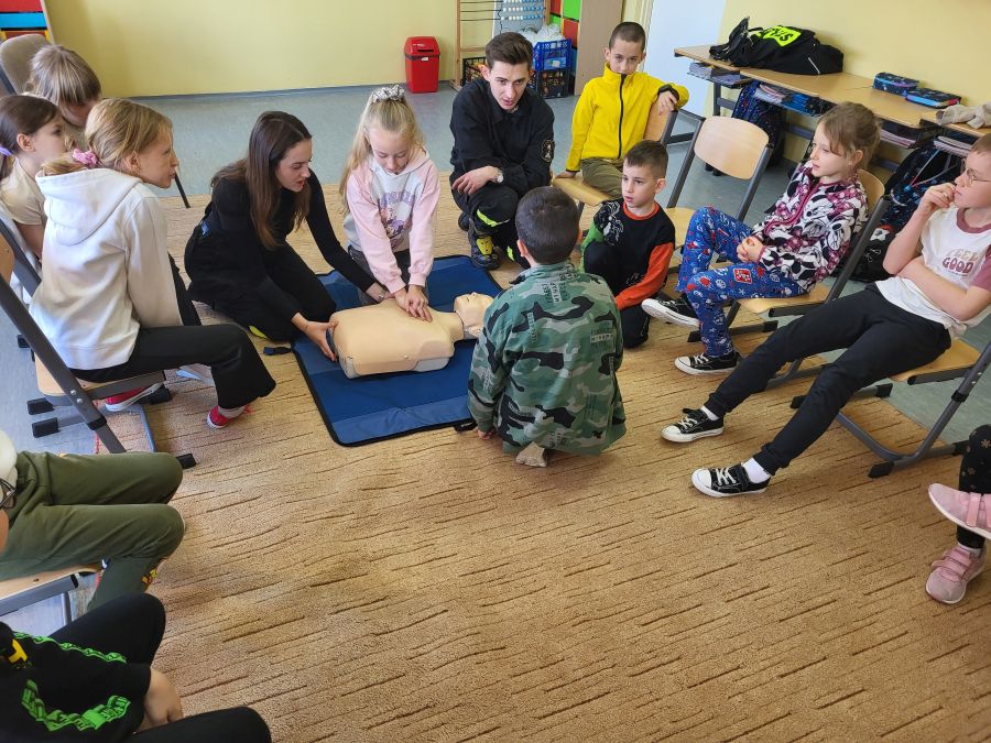 Pokazali uczniom pięć zasad postępowania podczas udzielania pomocy poszkodowanym w wypadkach samochodowych. Absolutnym atutem tego spotkania były indywidualne ćwiczenia z fantomem. Pod czujnym okiem strażaków dzieci przeprowadzały resuscytację poszkodowanego. Można było zaobserwować wielkie zaangażowanie uczniów. Celem tych zajęć jest jest wykształcenie poczucia odpowiedzialności za siebie i innych, uwrażliwienie na krzywdę drugiego człowieka, a przede wszystkim zaszczepienie idei niesienia bezinteresownej pomocy.