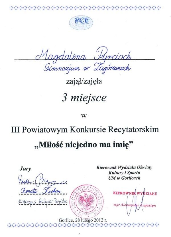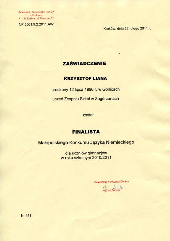 Krzysztof Liana - uczeń kl. III b Gim. dostarczył nam szczególnych powodów do radości i dumy. Już po raz drugi zdobył tytuł finalisty Małopolskiego Konkursu Języka Niemieckiego dla uczniów gimnazjów województwa małopolskiego. Nad rozwojem ucznia uzdolnionego czuwa mgr Karina Szura, nauczycielka j.niemieckiego oraz j.angielskiego.