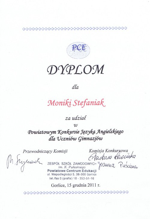 Dnia 15 grudnia 2011 roku w Powiatowym Centrum Edukacji w Gorlicach odbył się Powiatowy Konkurs Języka Angielskiego pt. „Wiedza o Nowej Zelandii”. W konkursie tym wzięło udział 17 uczniów z naszego powiatu. Naszą szkołę godnie reprezentowali uczniowie klasy drugiej gimnazjum: Monika...