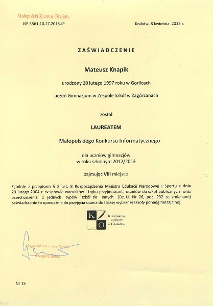 Zakończyły się zmagania w konkursach przedmiotowych organizowanych przez Małopolskiego Kuratora Oświaty w roku szkolnym 2012/2013. Nasi dwaj uczniowie sięgnęli...
