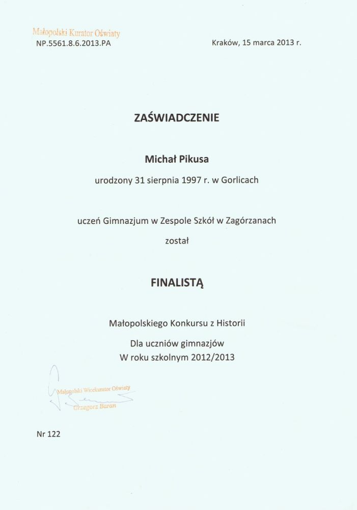 Michał Pikusa – finalista Małopolskiego Konkursu Historycznego
