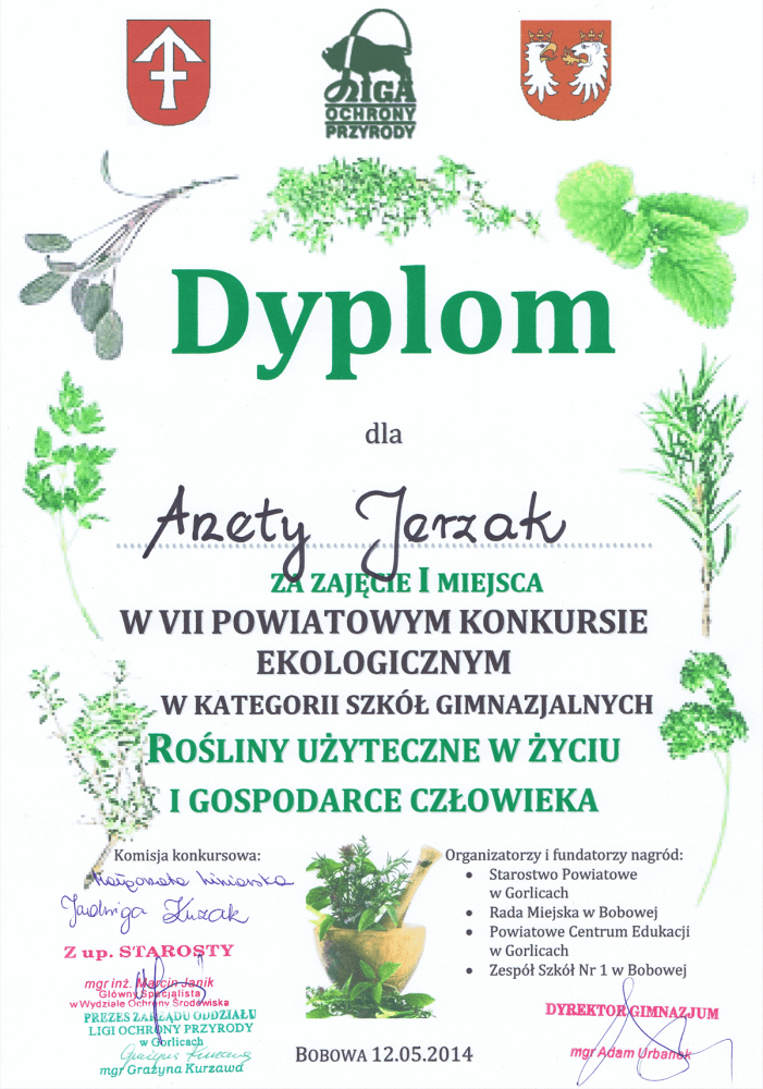 W poniedziałek 12. maja b.r. w Zespole Szkół nr 1 w Bobowej odbył się VII Powiatowy Konkurs Ekologiczny dla uczniów szkół gimnazjalnych. Nasza uczennica Aneta Jerzak została laureatką tego konkursu, zajmując I miejsce w powiecie.