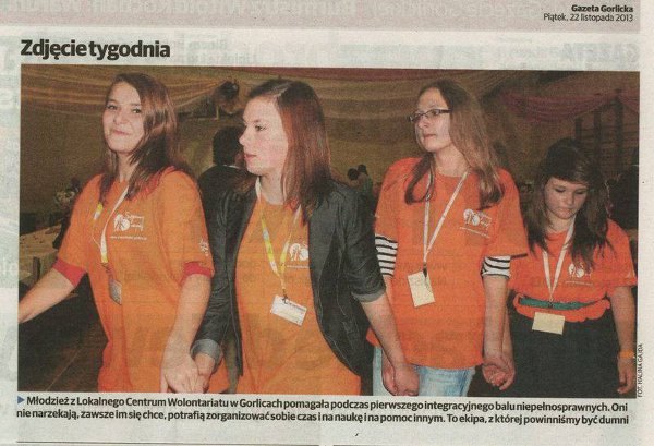 Wolontariuszki ze Szkolnego Klubu Wolontariatu (Karolina Hajduk, Paulina Szura oraz Justyna Wałęga) sobotni wieczór 16 listopada 2013 r. spędziły pracowicie służąc pomocą podczas I Integracyjnego Balu Andrzejkowego dla Osób z Niepełnosprawnością z terenu powiatu gorlickiego. Impreza odbyła się na sali gimnastycznej I Liceum Ogólnokształcącego im...