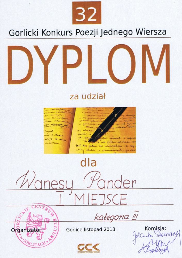 W Gorlickim Centrum Kultury dnia 26. listopada br.odbył się XXXII Gorlicki Konkurs Poezji Jednego Wiersza. Nasze gimnazjum reprezentowały: Wanesa Pander z klasy II oraz Jolanta Mitoraj i Kamila Rolak z klasy III. Przygotowywały się pod kierunkiem mgr Krystyny Holik i mgr Joanny Nosal. W zmaganiach ze słowem poetyckim łacznie udział wzięło 63 osoby...