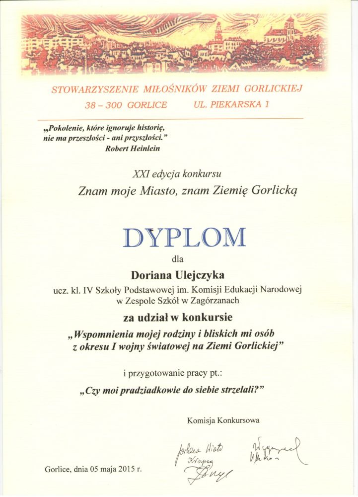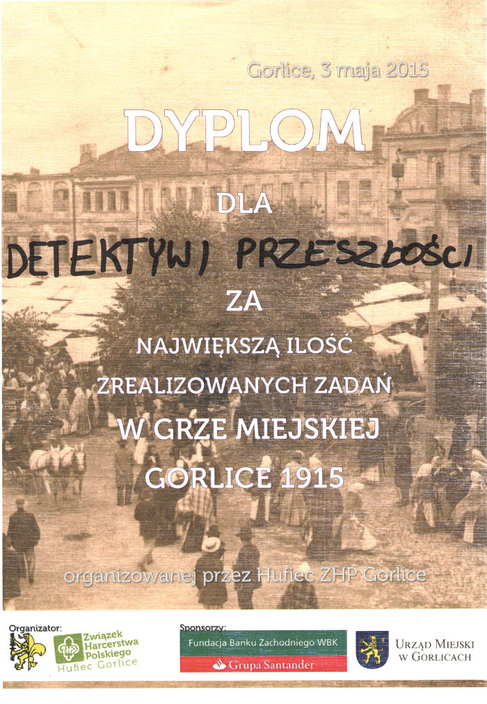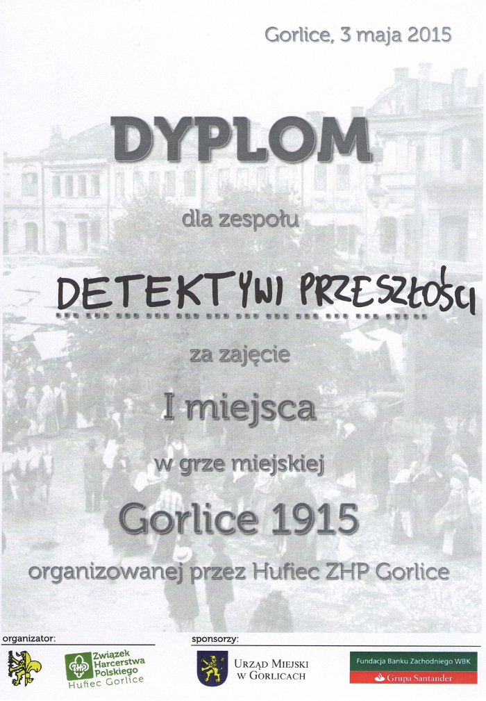 Chcieli innego uczestnictwa w obchodach, zaintrygowała ich propozycja Związku Harcerstwa Polskiego Hufca Gorlice. Na potrzeby gry miejskiej „Gorlice 1915”: Alicja i Angelika Wachowicz, Rafał Siarkowicz oraz Kamil Kurzawa zawiązali grupę „Detektywi przeszłości”. Zespołem dowodził rodzic, pan Grzegorz Wachowicz. Dzień 3 maja 2015 roku...