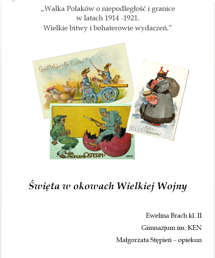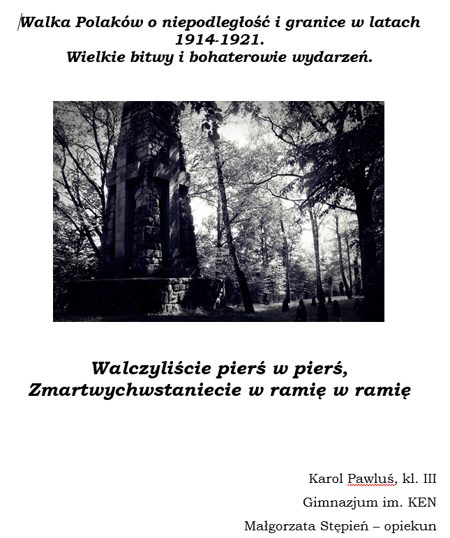 Uczniowie Gimnazjum: Ewelina Brach z kl. II oraz Karol Pawluś z kl. III biorą udział w konkursie tematycznym Walka Polaków o niepodległość i granice w latach 1914-1921. Wielkie bitwy i bohaterowie wydarzeń prowadzonym przez Oddział IPN w Krakowie pod patronatem Małopolskiego Kuratora Oświaty. Pomyślnie przeszli etap szkolny rozwiązali test...