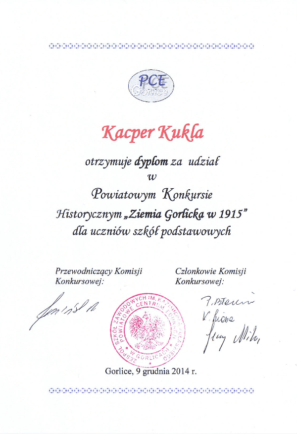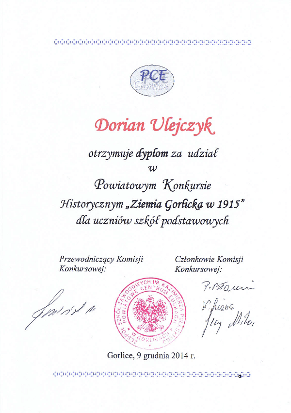 Uczniowie Dorian Ulejczyk z kl. IV oraz Kacper Kukla z kl. V reprezentowali naszą szkołę w finale Powiatowego Konkursu Historycznego „Ziemia Gorlicka 1915” dla uczniów szkół podstawowych. We wtorek 9 grudnia 2014 r. w siedzibie PCE w grupie 36 uczestników zmagali się z zadaniami testowymi, które dotyczyły okresu Wielkiej Wojny ze...