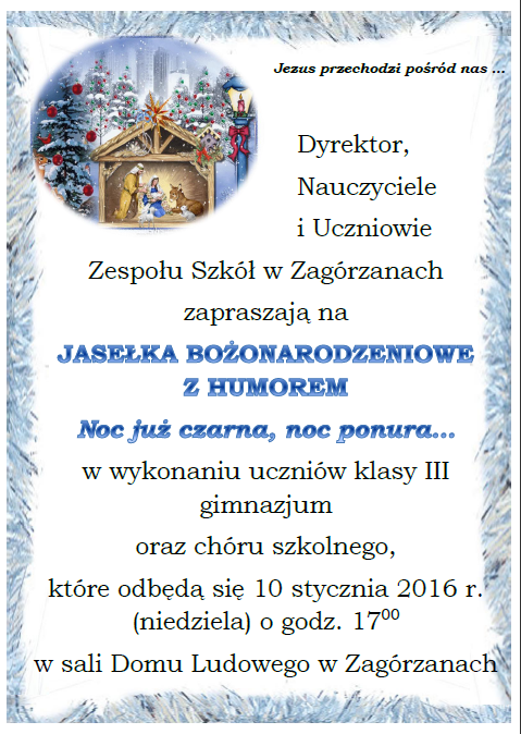 W niedzielne popołudnie 10. stycznia mieszkańcy Zagórzan tłumnie zgromadzili się w sali widowiskowej Domu Ludowego, aby obejrzeć humorystyczną wersję przedstawienia bożonarodzeniowego. Występy młodzieży gimnazjalnej i szkolnego chóru podziwiali rodzice, dziadkowie, sąsiedzi. Oficjalnymi gośćmi byli: mgr Franciszek Rzeszutek Dyrektor Ośrodka Kultury Gminy Gorlice, mgr Monika Skowronek instruktor OKGG oraz Michał Pyrcioch sołtys Zagórzan.