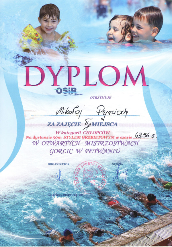 Dyplomy w zawodach pływackich uzyskane przez Mikołaja Pyrciocha w otwartych mistrzostwach Gorlic i Skawiny.