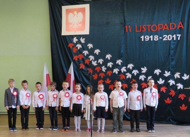 Święto Odzyskania Niepodległości przez Polskę to dla naszego narodu, czas radości i dumy. By uczcić 99 rocznicę odzyskania przez Polskę niepodległości, w naszej szkole 10 listopada 2017 r. odbył się Przegląd Pieśni Patriotycznych. Pomysłodawcą imprezy byli członkowie samorządu uczniowskiego, którzy z pomocą opiekuna opracowali scenariusz oraz scenografię. W tym dniu wszyscy śpiewali o Polsce i dla Polski. Śpiewając, opowiadali o ważnych wydarzeniach w dziejach naszej Ojczyzny. Spotkanie prowadzili uczniowie klasy 7 SP: Gabriela Czyżyk i Adrian Brach, którzy każdą z wykonywanych pieśni poprzedzali komentarzem. Był on krótkim opisem dziejów Polski oraz historią powstania pieśni patriotycznych od czasów powstania listopadowego aż po czasy współczesne. Uczniowie każdej klasy pod kierunkiem wychowawcy prezentowali jedną pieśń patriotyczną. Wybór pieśni dokonał się w drodze losowania miesiąc wcześniej, a wokalne dopracowanie utworów pod względem intonacyjnym czy rytmicznym miało miejsce na zajęciach z wychowawcą. Muzyczna ucztę zakończyła pieśń hymniczna Rota, którą wykonali nauczyciele. Poprzez te pieśni pragnęliśmy przywołać w naszej pamięci bohaterów narodowych - tych znanych z imienia i nazwiska, a także tych, których imion nie znamy.