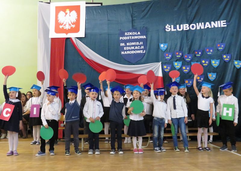 16 października 2017 r. to pamiętna data dla Pierwszoklasistów. W tym dniu w naszej szkole odbyła się podwójna uroczystość: Ślubowanie uczniów klasy I i Dzień Edukacji Narodowej. Zanim nastąpił ten ważny w życiu każdego ucznia moment, dzieci zaprezentowały swoje umiejętności przed przybyłymi na uroczystość rodzicami i starszymi kolegami. Pierwszoklasiści pod okiem swojej wychowawczyni przygotowali program artystyczny, w którym zaprezentowali swoje umiejętności wokalne i recytatorskie. W odświętnych strojach, w niebieskich biretach na głowach pierwszacy błysnęli talentem. Znajomość przepisów ruchu drogowego, wiedza dotyczącą naszej ojczyzny, przyjaźń i koleżeństwo w grupie rówieśniczej to dowód, że dzieci są gotowe do sumiennej pracy w szkole. W niezwykle podniosłej atmosferze, przed pocztem sztandarowym pierwszacy ślubowali być dobrymi Polakami, godnie reprezentować swoją szkołę, swym zachowaniem sprawiać radość rodzicom i nauczycielom. Następnie pani dyrektor Iwona Jamro „wielkim ołówkiem" dokonała pasowania na ucznia. Zwieńczeniem uroczystości było wręczenie dzieciom pamiątkowych dyplomów i legitymacji szkolnych.