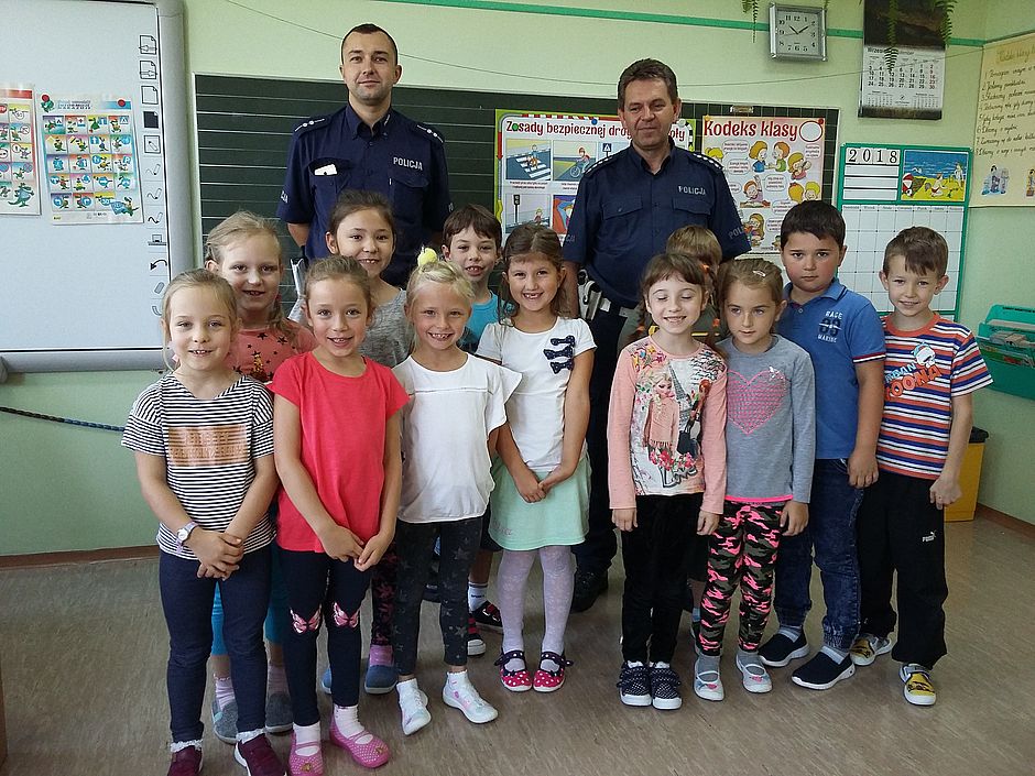 Dzień 7 września długo zostanie w pamięci pierwszoklasistów. Ależ to była niesamowita wizyta! Uczniów odwiedzili policjanci z Komendy Powiatowej w Gorlicach. Rozmawiali z dziećmi o bezpiecznym poruszaniu się po drogach, a w szczególności omówili zasady bezpiecznej drogi do i ze szkoły. Przypomnieli również o korzyściach noszenia elementów odblaskowych przy ubraniu bądź tornistrze oraz zasadach przewożenia dzieci w samochodzie. W trakcie spotkania policjanci podkreślali, jak ważna jest znajomość numerów alarmowych. Cała pogadanka oparta była na krótkich, ciekawych przykładach, które dzieci wysłuchały z zainteresowaniem.