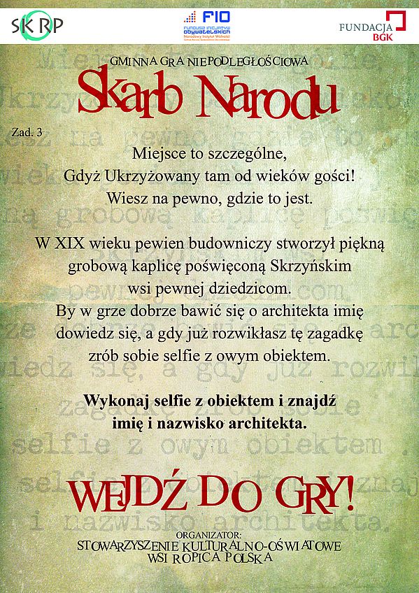 Wystartowaliśmy! Gminna Gra Niepodległościowa „Skarb Narodu” została zaprogramowana przez Stowarzyszenie Kulturalno-Oświatowe Wsi Ropica Polska dla uczniów klas szkół podstawowych Gminy Gorlice. Inicjatywa projektu „Na 100 Niepodległa” służy uczczeniu setnej rocznicy odzyskania przez Polskę niepodległości. Śledzimy losy tajemniczego listu Anatola Skrzyńskiego, który odniósł ciężkie rany podczas przełomowej bitwy pod Gorlicami, jednak przed śmiercią zdążył ukryć sekret gdzieś na wzgórzu Pustki. Informacja została zaszyfrowana, staramy się złamać kod. Śmiałkowie weszli do gry! Etap szkolny odbyła się w kolejne dni 18, 19, 20 września, uczestnicy odbierali zadania: rozpoznawanie obiektów, wykreślanie hasła, odnalezienie i sfotografowanie kaplicy grobowej Skrzyńskich, i na bieżąco odsyłali drogą internetową rozwiązania. Z naszej szkoły do Wielkiego Finału w Łużnej zakwalifikowały się drużyny: „Zagórzańskie Orły” – Martyna Machowska, Zuzanna Śliwa i Bartosz Dziki, „Waleczne Dziewczyny” – Martyna Bargieł, Amelia Pyrcioch i Angelika Wachowicz, „Szara Piechota” – Adrian Brach, Konrad Fugiel i Patryk Mońka. Trzymamy kciuki za graczy z Zagórzan, może to oni na wzgórzu Pustki odkryją „Skarb Narodu”?